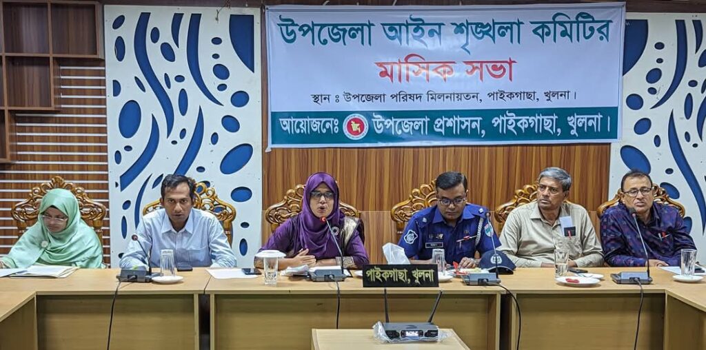 এম জালাল উদ্দীন:পাইকগাছা ::: পাইকগাছা উপজেলা আইনশৃঙ্খলা কমিটির ও সমন্বয় কমিটির মাসিক সভা অনুষ্ঠিত হয়েছে। এ উপলক্ষে বুধবার সকাল ১০টা উপজেলা পরিষদ মিলনায়তনে উপজেলা প্রশাসন কর্তৃক আয়োজিত পৃথক সভায় সভাপতিত্ব করেন, উপজেলা নির্বাহী অফিসার মাহেরা নাজনীন। সভায় বক্তব্য রাখেন, উপজেলা সহকারী কমিশনার ভূমি মোঃ ইফতেখারুল ইসলাম শামীম, (ওসি তদন্ত) মোঃ ইদ্রিসুর রহমান, শিক্ষা অফিসার বিদ্যুৎ রঞ্জন শাহা, উপাধ্যক্ষ মিহির বরন মন্ডল, সিনিয়র মৎস্য কর্মকর্তা সৈকত মল্লিক, উপজেলা প্রকৌশলী মোঃ শাফিন শোয়েব, মহিলা বিষয়ক কর্মকর্তা রেশমা আক্তার। এসময়ে অন্যদের মধ্যে উপস্থিত ছিলেন,উপজেলা প্রকল্প বাস্তবায়ন কর্মকর্তা রাজীব বিশ্বাস, সমাজসেবা কর্মকর্তা অনাথ কুমার বিশ্বাস, পরিসংখ্যান অফিসার,,, সিনিয়র আলিম মাদ্রাসার প্রিন্সিপাল মোঃ আজহার আলী, মুক্তিযোদ্ধা রুহুল আমিন, জনস্বাস্থ্য উপ-প্রকৌশলি প্রশান্ত কুমার পাল, পরিবার পরিকল্পনা কর্মকর্তা আব্দুল্লাহ আল-মামুন, সমবায় কর্মকর্তা হুমায়ুন কবির, চেয়ারম্যান আব্দুস সালাম কেরু, প্রেসক্লাব পাইকগাছা এর সাধারণ সম্পাদক এম জালাল উদ্দীন, প্যানেল চেয়ারম্যান জাহাঙ্গীর আলম সানা, সুকুমার কবিরাজ, আব্দুল্লাহ সরদার, আবুল হাসেম, পীযুষ মন্ডল, প্রধান শিক্ষক দেবাশীষ সরদার, আব্দুল ওহাব, উপজেলা সিএ আব্দুল বারী, কৃষ্ণ পদ মন্ডল সহ বিভিন্ন দপ্তরের কর্মকর্তা ও সাংবাদিক বৃন্দ। উল্লেখ্য, সভায় অবৈধভাবে নদীর জমি দখল রোধে কার্যকরী পদক্ষেপ, দুর্যোগ মোকাবেলা, কুরবানির পশুর হাটে জাল টাকা ও যে ধরনের অনিয়ম রোধে গুরুত্বপূর্ণ পদক্ষেপ গ্রহণের সিদ্ধান্ত গৃহীত হয়