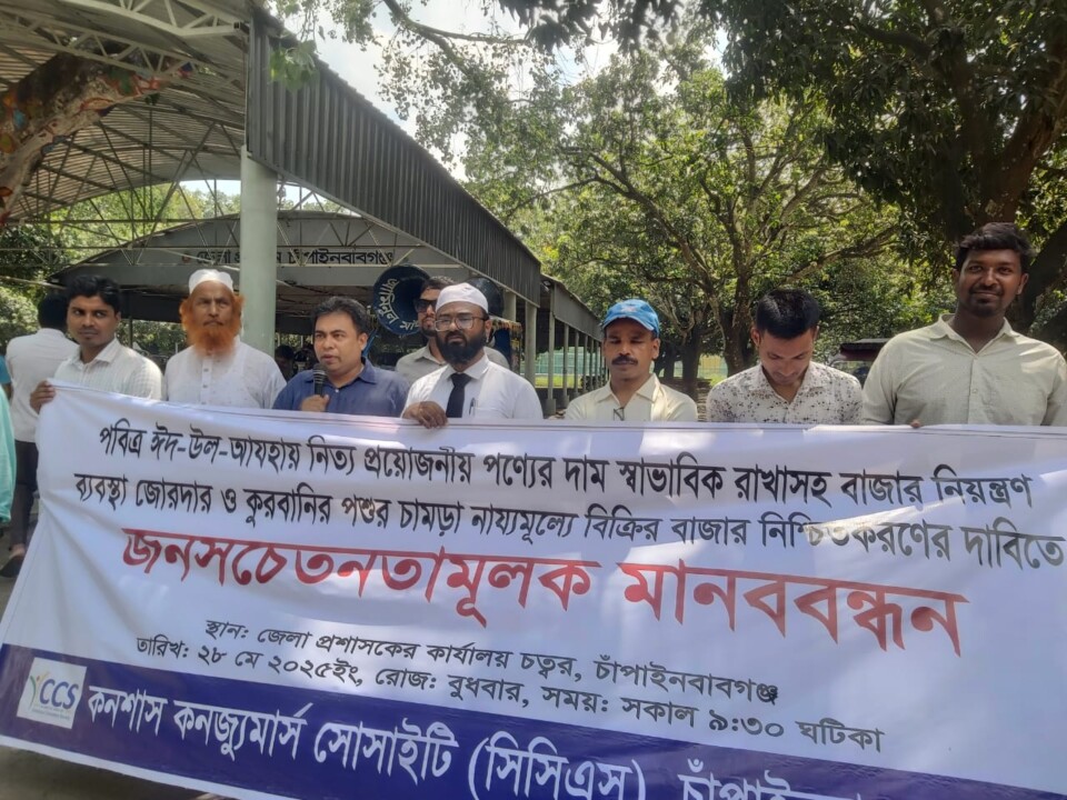 মাহিদুল ইসলাম ফরহচাঁপাইনবাবগঞ্জ জেলা প্রতিনিধি :: পবিত্র ঈদ-উল-আযহায় নিত্য পণ্যের দাম স্বাভাবিক রাখাসহ বাজার নিয়ন্ত্রণ ব্যবস্থা জোরদার, পরিবহনের যাত্রী ভাড়া স্বাভাবিক রাখা ও কুরবানির পশুর চামড়া নায্যমূল্যে বিক্রির বাজার নিশ্চিতকরণের দাবিতে জনসচেতনতামূলক মানববন্ধন কর্মসূচি করেছে কনশাস কনজ্যুমার্স সোসাইটি (সিসিএস) চাঁপাইনবাবগঞ্জ জেলা শাখা। বুধবার সকাল ১০ টায় চাঁপাইনবাবগঞ্জ জেলা প্রশাসক কার্যালয় চত্বরে এই কর্মসূচি পালিত হয়। ভোক্তা অধিকার ভিত্তিক সংগঠন সিসিএস চাঁপাইনবাবগঞ্জ শাখার কো-অর্ডিনেটর, রাজশাহী প্রেসক্লাবের আজীবন সদস্য ও সাবেক সাধারণ সম্পাদক এ্যাডভোকেট মো. আসলাম-উদ-দৌলার সভাপতিত্বে মানববন্ধন কর্মসূচিতে বক্তব্য রাখেন- সুশাসনের জন্য নাগরিক-সুজন চাঁপাইনবাবগঞ্জ জেলা শাখার সাধারণ সম্পাদক ওযমুনাটিভিরচাঁপাইনবাবগঞ্জ ব্যুরো মনোয়ার হোসেন জুয়েল, ভোক্তা অধিকার সচেতন নাগরিক সমাজের প্রতিনিধি ড. মো. শরিফুল ইসলাম, স্থানীয় এতিমখানার সভাপতি শফিকুল ইসলাম, রবিউল আওয়াল, আহাদ আলী, হাফিজুর রহমান, মো. মানিক, হৃদয়, আনাস প্রমুখ। কর্মসূচি সঞ্চালনা করেন এসএম মহিউদ্দিন মুরাদ।