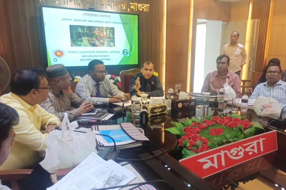 (তৌহিদ , মাগুরা) :::মাগুরায় সোশ্যাল ডেভেলপমেন্ট ফাউন্ডেশন (এসডিএফ), আর্থিক প্রতিষ্ঠান বিভাগ, অর্থ মন্ত্রণালয়। রেজিলিয়েন্স এন্ট্রাপ্রেনিওরশীপ অ্যান্ড লাইভলিহুড ইমপ্রুভমেন্ট (আরইএলআই) প্রজেক্ট স্টেকহোল্ডার কর্মশালা অনুষ্ঠিত হয়। বুধবার ২৮ মে দুপুর ১২ টায় মাগুরা জেলা প্রশাসকের সম্মেলন কক্ষে মাগুরা জেলা অফিস সোশ্যাল ডেভেলপমেন্ট ফাউন্ডেশন (এসডিএফ) এর আয়োজনে স্টেকহোল্ডার কর্মশালা পালিত হয়। এসডিএফ এর পরিচিতি- গণপ্রজাতন্ত্রী বাংলাদেশ সরকারের মহামান্য রাষ্ট্রপতির প্রজ্ঞাপনের মাধ্যমে সোশ্যাল ডেভেলপমেন্ট ফাউন্ডেশন (এসডিএফ) দারিদ্র বিমোচন প্রচেষ্টার অংশ হিসেবে সরকার ২০০০ সালে প্রতিষ্ঠা করে। কোম্পানি আইন ১৯৯৪ এর আওতায় একটি অলাভজনক সংস্থা হিসেবে এই প্রতিষ্ঠান নিবন্ধিত হয়। গণপ্রজাতন্ত্রী বাংলাদেশ সরকারের অর্থ মন্ত্রণালয়ের আর্থিক প্রতিষ্ঠান বিভাগের অধীন একটি অলাভজনক ও স্বায়ত্তশায়িত প্রতিষ্ঠান। ২০০১ সাল থেকে অদ্যাবধি গ্রামীন দরিদ্র ও অতিদরিদ্র মানুষের আর্থসামাজিক উন্নয়নে কাজ করে যাচ্ছে। অনুপ কুমার এর সঞ্চালনায় অনুষ্ঠানে সভাপতিত্ব করেন যশোর অঞ্চল এসডিএফ আঞ্চলিক পরিচালক মোঃ কামাল বাশার, প্রধান অতিথি হিসেবে উপস্থিত ছিলেন মাগুরা জেলা প্রশাসক মোঃ অহিদুল ইসলাম। এছাড়াও উপস্থিত ছিলেন মাগুরা সিভিল সার্জন ডাঃ মোঃ শামীম কবির, মহিলা বিষয়ক অধিদপ্তর উপপরিচালক আব্দুল আওয়াল, কৃষি সম্প্রসারন অধিদপ্তর খামারবাড়ি এডিডি বিষ্ণু পদ সাহা, জেলা প্রাণী সম্পদ অফিসার মিহির কান্তি বিশ্বাস, জেলা সমাজসেবা কার্যালয় উপপরিচালক মোঃ জাকির হোসেন, বিসিক কার্যালয় উপব্যবস্থাপক অর্জুন কুমার বিশ্বাস, পুলিশ সুপার কার্যালয় পুলিশ পরিদর্শক (নি:) শরিফুল ইসলাম, জাতীয় নিরাপত্তা গোয়েন্দা সহকারী পরিচালক এনএসআই রাজীব হোসেন, জেলা সমবায় কার্যালয় সরেজমিনে তদন্তকারী হাসিবুর রহমান, সরকারি কলেজের সহকারী অধ্যাপক খান শফিউল্লাহ, মাগুরা প্রেসক্লাবের সাধারণ সম্পাদক শফিকুল ইসলাম শফিক ও মাগুরা সাংবাদিক ইউনিয়নের সভাপতি মোঃ ফারুক আহমেদ সহ প্রমুখ। এসডিএফ স্টেক হোল্ডার কর্মশালায় আত্মকর্মসংস্থানে সাফল্য ৩ জন নারী বক্তব্য রাখেন, তারা হলেন শালিখা উপজেলার বাউলিয়া পূর্ব পাড়ার মাগুরা জেলা আরইএলআই সভাপতি স্বপ্না বিশ্বাস, মহম্মদপুর উপজেলার পশ্চিম ধোয়াইল গ্রামের ক্ষুদ্র ব্যবসা শিউলী ইসলাম ও মাগুরা সদর উপজেলার পাইকেল গ্রামের কাকলী খাতুন। মাগুরা সদর উপজেলার মঘী, রাঘবদাইড়, চাউলিয়া, বগিয়া, শত্রুজিৎপুর, কুচিয়ামোড়া, গোপালগ্রাম, ও জগদল এই ৮ টি ইউনিয়নের ৭৫ টি গ্রাম, শালিখা উপজেলার তালখড়ি, শালিখা, শতখালী, বুনাগাতী ও গঙ্গারামপুর এই ৫ টি ইউনিয়নের ৫০ টি গ্রাম এব