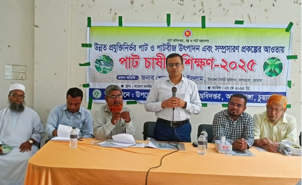 আলমডাঙ্গায় পাট চাষ ও বীজ উৎপাদন, সচেতনতা ও দক্ষতাবৃদ্ধির লক্ষ্যে দিনব্যাপী পাটবীজ উৎপাদনকারী চাষীদের প্রশিক্ষণ দেওয়া হয়েছে। উপজেলা প্রশাসন ও পাট অধিদপ্তরের উদ্যোগে সকাল দশটার দিকে মুক্তিযোদ্ধা সংসদ মিলনায়তনে প্রযুক্তিনির্ভর পাট ও পাটবীজ উৎপাদন এবং সম্প্রসারন প্রকল্পের আওতায় তালিকাভুক্ত ৭৫ জন চাষিদের এই প্রশিক্ষণ দেওয়া হয়। প্রশিক্ষণ কর্মসূচিতে চাষীদের আধুনিক পদ্ধতিতে উন্নত মানের পাটচাষ ও বীজ উৎপাদন সংশ্লিষ্ট বিষয়ে সচেতনতা ও দক্ষতা বৃদ্ধির লক্ষ্যে বিভিন্ন টেকনিক্যাল বিষয়ে প্রশিক্ষণ দেওয়া হয়।প্রশিক্ষণে চুয়াডাঙ্গা জেলা পাট উন্নয়ন কর্মকর্তা হারুনার রশিদের সভাপতিত্বে প্রধান অতিথি হিসেবে উপজেলা নির্বাহী অফিসার মেহেদী ইসলাম। বিশেষ অতিথি ছিলেন উপজেলা কৃষি সম্প্রসারণ কর্মকর্তা কৃষিবিদ সাইফুল্লাহ মাহমুদ, মুক্তিযোদ্ধা সংসদের সাবেক কমান্ডার বীর মুক্তিযোদ্ধা আবুল কাশেম, আলমডাঙ্গা প্রেসক্লাবের সভাপতি খন্দকার শাহ আলম মন্টু, যমুনা সম্পাদক বশিরুল আলম, চুয়াডাঙ্গা সদর উপসহকারী পাট উন্নয়ন কর্মকর্তা জাকির হোসেন। আলমডাঙ্গা উপজেলা উপসহকারী পাট উন্নয়ন কর্মকর্তা কামরুল হাসানের পরিচালনায় বক্তব্য রাখেন উপজেলা মডেল মসজিদের ইমাম মাওলানা মাসুদ কামাল, পাট চাষী রফিকুল ইসলাম, পাট চাষী নাসির উদ্দিন, পাট চাষী বকুল হোসেন, পাট চাষী শাহজাহান পাট চাষী আজিরন খাতুন, সাজেদা খাতুন প্রমুখ।এতে বক্তারা বলেন, পাটের সুদিন ফিরিয়ে আনতে পাট অধিদপ্তর বদ্ধপরিকর। সেজন্য পাটপণ্যের ব্যবহার বাধ্যতামূলক করা হয়েছে। এছাড়া পাট চাষিদের বিভিন্ন প্রণোদনা দেওয়া হচ্ছে। কর্মশালায় উপজেলার বিভিন্ন ইউনিয়নের ৭৫ জন পাট চাষীকে পাট চাষ, জাগ ও আঁশ ছাড়ানোসহ আধুনিক পদ্ধতিতে উন্নত মানের পাট চাষের বিষয়ে প্রশিক্ষণ দেওয়া হয়।