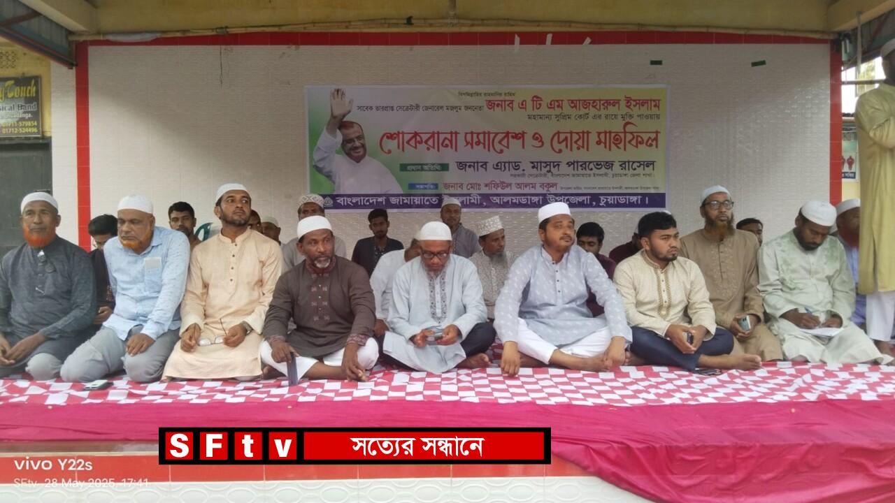 বাংলাদেশ জামায়াতে ইসলামীর সাবেক ভারপ্রাপ্ত কেন্দ্রীয় সেক্রেটারি জেনারেল এ টি এম আজহারুল ইসলাম মহামান্য সুপ্রিম কোর্টের রায়ে মুক্তি পাওয়ায় আলমডাঙ্গায় ব্যাপকভাবে পালিত হয়েছে শোকরানা সমাবেশ, মিষ্টি বিতরণ ও দোয়া মাহফিল। বুধবার (৩০ মে) বিকেল সাড়ে ৫টায় আলমডাঙ্গা উপজেলা মঞ্চে বাংলাদেশ জামায়াতে ইসলামী আলমডাঙ্গা উপজেলা, পৌর ও জি এ থানা শাখার যৌথ উদ্যোগে এ আয়োজন করা হয়। এ উপলক্ষে উপজেলার বিভিন্ন মাদ্রাসায় মিষ্টি বিতরণ করা হয়। শোকরানা মাহফিলে পবিত্র কুরআন থেকে তেলাওয়াত করেন আলমডাঙ্গা পৌর যুব বিভাগের সহ-সভাপতি শাহিন শাহিদ। অনুষ্ঠানে সভাপতিত্ব করেন আলমডাঙ্গা উপজেলা জামায়াতের আমীর ও উপজেলা ভাইস চেয়ারম্যান পদপ্রার্থী প্রভাষক শফিউল আলম বকুল। প্রধান অতিথি হিসেবে উপস্থিত ছিলেন চুয়াডাঙ্গা জেলা জামায়াত মনোনীত চুয়াডাঙ্গা-১ আসনের সংসদ সদস্য প্রার্থী, জেলা সহকারী সেক্রেটারি অ্যাডভোকেট মাসুদ পারভেজ রাসেল। তিনি বলেন, “আমাদের আমীরে জামায়াত মাওলানা মতিউর রহমান নিজামী, আল্লামা দেলোয়ার হোসেন সাঈদীসহ জামায়াতের শীর্ষস্থানীয় নেতাদের অন্যায়ভাবে ফাঁসি দেয়া হয়েছে। কিন্তু ৫ আগস্ট ফ্যাসিস্ট আওয়ামী সরকারের পতনের পর বাংলাদেশ জামায়াতে ইসলামী সর্বসাধারণের কাছে একটি সুশৃঙ্খল আদর্শিক সংগঠনের রূপে পুনরায় আত্মপ্রকাশ করেছে। আমাদের কোনো নেতা-কর্মী মাদক, সন্ত্রাস কিংবা চাঁদাবাজির সঙ্গে যুক্ত নন। অন্য দলগুলো নিজেরা মারামারি করে মারা পড়ছে, আর তারা জনগণকে স্বপ্ন দেখানোর কথা বলে।” বিশেষ অতিথি হিসেবে বক্তব্য রাখেন বাংলাদেশ ইসলামী ছাত্রশিবির চুয়াডাঙ্গা জেলা সভাপতি সাগর আহমেদ, জেলা সমাজকল্যাণ সম্পাদক আলতাফ হোসাইন, যুব বিভাগের সভাপতি নূর মোহাম্মদ হোসেন টিপু, আইন বিষয়ক সম্পাদক দারুস সালাম, জি এ থানা আমীর আব্বাস উদ্দিন এবং আলমডাঙ্গা পৌর আমীর মাহের আলী। এছাড়াও উপস্থিত ছিলেন উপজেলা সেক্রেটারি মামুন রেজা, উপজেলা নায়েবে আমীর ইউসুফ আলী মাস্টার, পৌর সেক্রেটারি মুসলিম উদ্দিনসহ দলীয় নেতৃবৃন্দ। সমাবেশটি সঞ্চালনা করেন জি এ থানা শাখার সেক্রেটারি কামরুল হাসান সোহেল। অনুষ্ঠান শেষে দোয়া পরিচালনা করেন আলমডাঙ্গা পৌর জামায়াতের নায়েবে আমীর ও আলমডাঙ্গা বড় মসজিদের খতিব মাওলানা জুলফিকার আলী। তিনি দেশ, জাতি ও ইসলামি আন্দোলনের সফলতা কামনায় বিশেষ মোনাজাত করেন। শোকরানা মাহফিলে স্থানীয় জামায়াত নেতৃবৃন্দ, কর্মী এবং সাধারণ জনগণের উপস্থিতি ছিল চোখে পড়ার মতো।