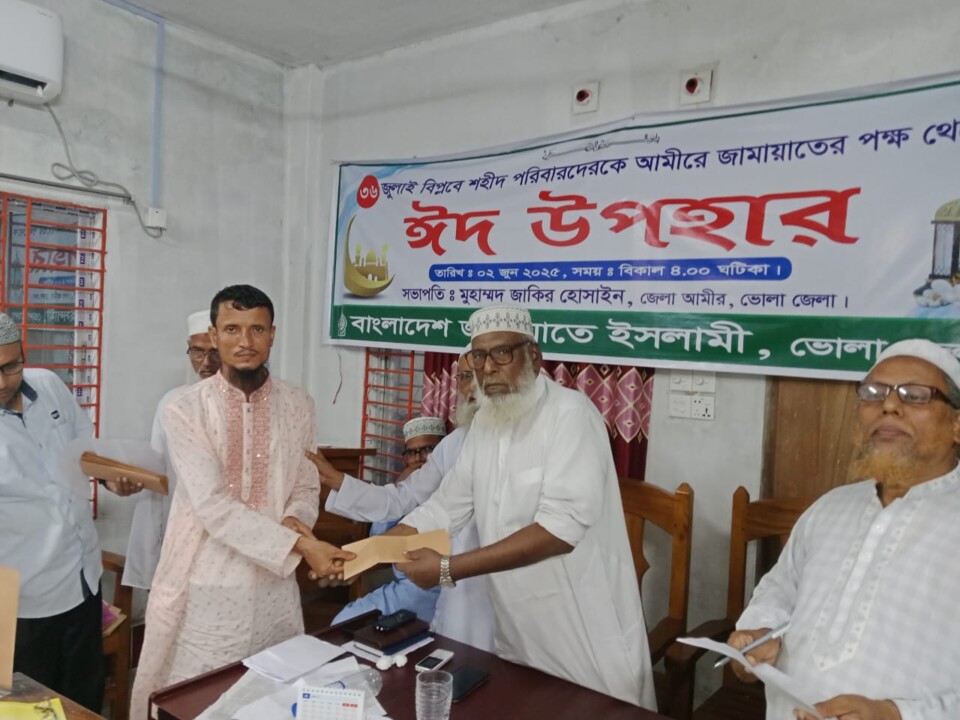 ছাত্র- জনতার গণঅভ্যুত্থানে ৩৬ জুলাই ২০২৪, শহীদ পরিবারকে ঈদ উপহার হিসেবে নগদ অর্থ প্রদান করেছেন বাংলাদেশ জামায়াতে ইসলামী ভোলা জেলা।২জুন সোমবার বাংলাদেশ জামায়াতে ইসলামী ভোলা জেলা কার্যালয়ে আমিরে জামায়াতের পক্ষ থেকে নগদ অর্থের মাধ্যমে এই ঈদ উপহার প্রদান করা হয়।বাংলাদেশ জামায়াতে ইসলামীর ভোলা জেলা সেক্রেটারি মাওলানা হারুনুর রশিদের সঞ্চালনায় এবং জেলা আমির মাস্টার জাকির হোসাইনের সভাপতিত্বে শহীদ পরিবারকে ঈদ উপহার প্রদান অনুষ্ঠানে উপস্থিত ছিলেন, বাংলাদেশ জামায়তে ইসলামী ভোলা-১ আসনের জামায়াত মনোনীত সংসদ সদস্য প্রার্থী অধ্যক্ষ নজরুল ইসলাম, ভোলা-২ আসনের জামায়াত মনোনীত সংসদ সদস্য প্রার্থী মাওলানা ফজলুল করিম, ভোলা-৩ আসনের জামায়াত সমর্থিত প্রার্থী নিজামুল হক নাঈম, ভোলা-৪ আসনের জামায়াত মনোনীত প্রার্থী মাওলানা মোস্তফা কামাল।উপহার গ্রহণ কালেশহীদ পরিবারের সদস্যগণ বলেন, আমরা আমাদের সন্তান স্বামী বাবা ভাইকে হারিয়ে শুধু একটি আশাই অপেক্ষা করছি এই বাংলাদেশটা বৈষম্যহীন এক বাংলাদেশে পরিণত হবে। এর বিকল্প কিছুই আশা করি না। বাংলাদেশ জামাতে ইসলামী আমাদেরকে যে সম্মান এবং শ্রদ্ধা দেখিয়ে আসছেন তাতে আমরা চির কৃতজ্ঞ। বাংলাদেশ জামাতে ইসলামীর মাধ্যমে বাংলাদেশটা বৈষম্যহীন কল্যাণমুখী রাষ্ট্রে পরিণত হোক এই আশা করছি।৩৬ জুলাই ভোলার ৪৬ শহীদ পরিবারের উপস্থিত ৩৩ পরিবারকে ১০ হাজার টাকা করে ৩৩০০০০ টাকার ঈদ উপহার প্রদান করা হয়। ইতিপূর্বে ৪৬ শহীদ পরিবাররকে বাংলাদেশ জামায়াতে ইসলামীর পক্ষ থেকে নগদ দুই লক্ষ টাকা করে অনুদান প্রদান করা হয়।