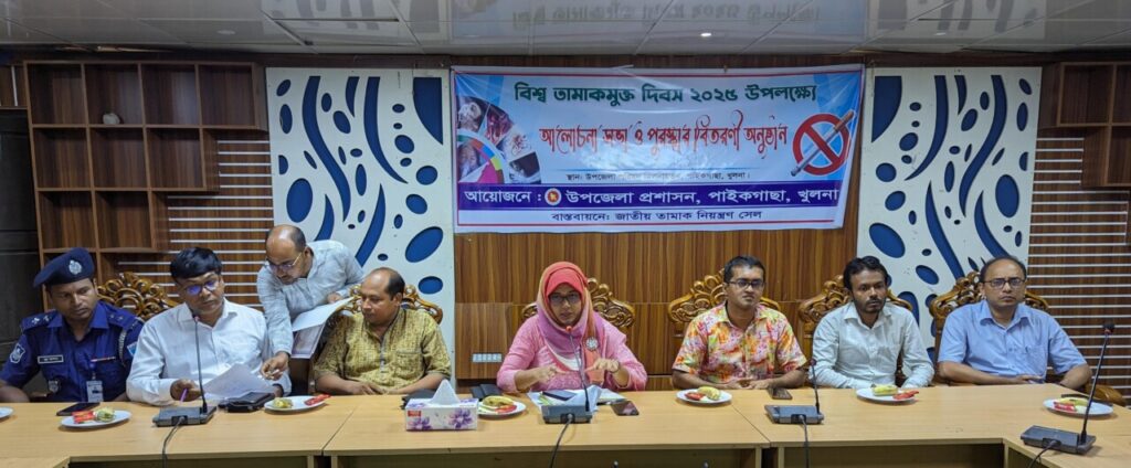 এম জালাল উদ্দীন:পাইকগাছা :: পাইকগাছা উপজেলা প্রশাসনের আয়োজনে বিশ্ব তামাকমুক্ত দিবস-২০২৫ উপলক্ষে র্যালী ও আলোচনা সভা ও পুরষ্কার বিতরণ অনুষ্ঠিত হয়েছে। মঙ্গলবার(৩ জুন) সকাল ১০ টায় র্যালী পরবর্তী উপজেলা পরিষদ মিলনায়তনে জাতীয় তামাক নিয়ন্ত্রণ সেল কর্তৃক আয়োজিত আলোচনা সভায় প্রধান অতিথি ছিলেন, উপজেলা নির্বাহী অফিসার মাহেরা নাজনীন। বিশেষ অতিথি ছিলেন, উপজেলা সহকারী কমিশনার ভূমি মোঃ ইফতেখারুল ইসলাম শামীম। আবাসিক মেডিকেল অফিসার ডাঃ সঞ্জয় কুমারের সভাপতিত্বে বক্তব্য রাখেন, উপজেলা সিনিয়র মৎস্য কর্মকর্তা সৈকত মল্লিক, প্রানি সম্পদ কর্মকর্তা পার্থ প্রতিম রায়, প্রেসক্লাব পাইকগাছা এর সভাপতি প্রকাশ ঘোষ বিধান, একাডেমি সুপার ভাইজার মীর নুরে আলম সিদ্দিকী, এসআই নুর আলম। উপজেলা স্যানিটারী ইন্সপেক্টর উদয় কুমার মন্ডলের উপস্থাপনায় অন্যদের মধ্যে উপস্থিত ছিলেন, উপজেলা ফুড অফিসার মোঃ হাসিবুর রহমান, মুক্তিযোদ্ধা রুহুল আমিন, পল্লী সঞ্চয় ব্যাংক কর্মকর্তা জয়ন্ত কুমার ঘোষ, পরিবার পরিকল্পনা কর্মকর্তা আব্দুল্লাহ আল-মামুন, এসএফডিএফ কর্মকর্তা জিএম জাকারিয়া, ষোলআনা ব্যবসায়ী সমবায় সমিতির সভাপতি জিএম শুকুরুজ্জামান, প্রেসক্লাব পাইকগাছা এর সাধারণ সম্পাদক এম জালাল উদ্দীন,ভারপ্রাপ্ত প্রধান শিক্ষক আঃ ওহাব, দেবাশীষ সরদার সহ বিভিন্ন দপ্তরের কর্মকর্তা ও স্কুল কলেজের শিক্ষক সহ ছাত্র ছাত্রীরা। আলোচনা সভা শেষে রচনা প্রতিযোগিতাকারী বিজয়ীদের মধ্যে পুরষ্কার বিতরণ করা হয়েছে।