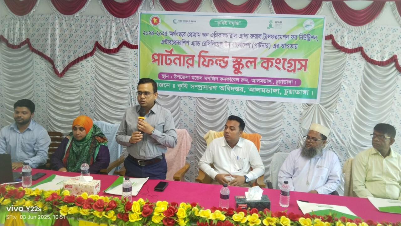 চুয়াডাঙ্গার আলমডাঙ্গায় কৃষি সম্প্রসারণ কার্যক্রমকে আরও জোরদার করতে অনুষ্ঠিত হলো ‘পার্টনার ফিল্ড স্কুল কংগ্রেস’। ২০২৪-২৫ অর্থবছরের প্রোগ্রাম অন এগ্রিকালচারাল এন্ড রুরাল ট্রান্সফরমেশন ফর নিউট্রিশন, এন্টারপ্রেনারশিপ এন্ড রেসিলিয়েন্স ইন বাংলাদেশ (পার্টনার) প্রকল্পের আওতায় এ কংগ্রেসের আয়োজন করে উপজেলা কৃষি সম্প্রসারণ অধিদপ্তর মঙ্গলবার সকাল ১০টায় আলমডাঙ্গা উপজেলা মডেল মসজিদের অডিটোরিয়ামে দিনব্যাপী এই কংগ্রেস অনুষ্ঠিত হয়। অনুষ্ঠানে সভাপতিত্ব করেন উপজেলা নির্বাহী কর্মকর্তা (ইউএনও) শেখ মেহেদী ইসলাম। প্রধান অতিথি হিসেবে উপস্থিত ছিলেন যশোর অঞ্চলের পার্টনার প্রোগ্রামের সিনিয়র মনিটরিং অফিসার শেখ সাজ্জাদ হোসেন। বিশেষ অতিথি হিসেবে উপস্থিত ছিলেন উপজেলা কৃষি সম্প্রসারণ অফিসার কৃষিবিদ সাইফুল্লাহ মাহমুদ, সমবায় অফিসের সরকারি পরিদর্শক সাহারুল ইসলাম, এবং মডেল মসজিদের ইমাম মাওলানা মাসুদ কামাল। অনুষ্ঠানে স্বাগত বক্তব্য দেন উপজেলা কৃষি অফিসার কৃষিবিদ রেহানা পারভীন। তিনি বলেন, “কৃষকের দক্ষতা ও উৎপাদনশীলতা বৃদ্ধিতে পার্টনার প্রকল্পের আওতায় ফিল্ড স্কুল, উত্তম কৃষি চর্চা, আধুনিক সেচ প্রযুক্তি, মানসম্মত তথ্য ব্যবস্থাপনা এবং ফার্মার্স সার্ভিস সেন্টার চালু করা হয়েছে। এই কংগ্রেসে কৃষক প্রতিনিধিদের অভিজ্ঞতা বিনিময়, বাস্তবভিত্তিক প্রশিক্ষণ এবং উদ্ভাবনী চর্চার প্ল্যাটফর্ম তৈরি হয়।” এছাড়াও বক্তব্য রাখেন অতিরিক্ত কৃষি সম্প্রসারণ কর্মকর্তা কৃষিবিদ উদয় রহমান, উপসহকারী কৃষি কর্মকর্তা আহসানুল হক, জাহিদুল ইসলাম, আশরাফুল ইসলাম, রফিকুল ইসলাম, আরিফুল ইসলাম এবং ছাত্র প্রতিনিধি রাকিব মাহমুদ। আলমডাঙ্গা উপজেলায় বর্তমানে ৪২টি পার্টনার ফিল্ড স্কুল (পিএফএস) রয়েছে। প্রতিটি ফিল্ড স্কুলে ২৫ জন করে কৃষক সদস্য অংশগ্রহণ করে থাকেন। এবারের কংগ্রেসে উপজেলার বিভিন্ন এলাকা থেকে মোট ১০০ জন প্রশিক্ষণপ্রাপ্ত কৃষক অংশ নেন। এই কংগ্রেসের মূল উদ্দেশ্য ছিল আধুনিক কৃষি পদ্ধতি ও প্রযুক্তির মাধ্যমে উৎপাদন বৃদ্ধি, কৃষকদের দক্ষতা উন্নয়ন এবং উৎপাদিত ফসলের সঠিক ব্যবহার নিশ্চিত করা। এটি কৃষি উন্নয়নের একটি গুরুত্বপূর্ণ পদক্ষেপ হিসেবে বিবেচিত হচ্ছে, যা ভবিষ্যতে টেকসই কৃষি ব্যবস্থার ভিত্তি গঠনে সহায়ক হবে।