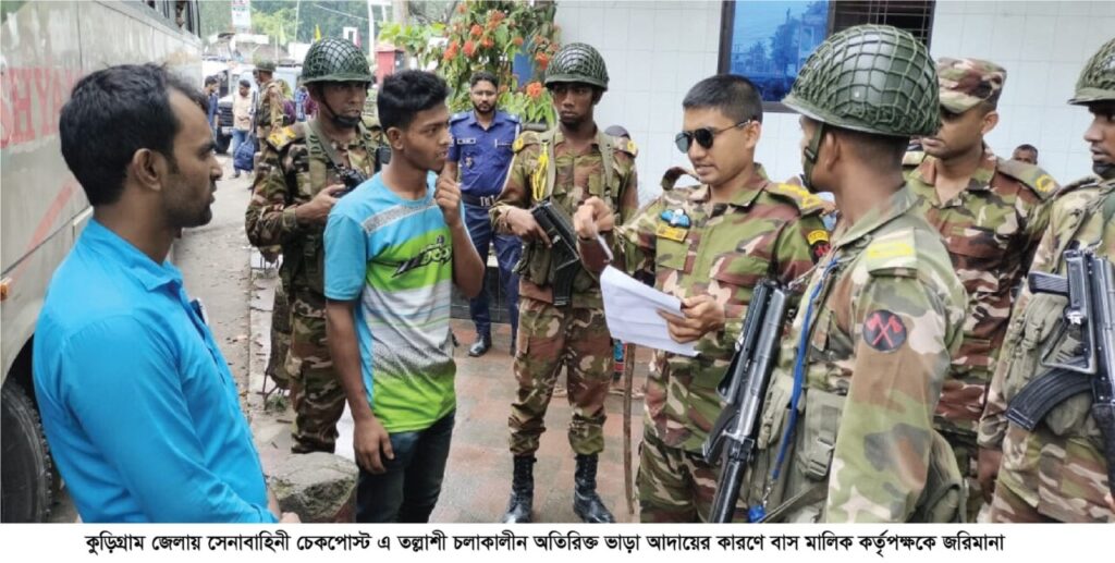 রুহুল আমিন রুকু, কুড়িগ্রাম প্রতিনিধি: ঈদে নাড়ীর টানে ঘর মুখো মানুষগন যাতে নিরাপদে বাড়ি ফিরতে পারে এবং অতিরিক্ত ভাড়া আদায় বন্ধের জন্য কুড়িগ্রামে দায়িত্বরত সেনাবাহিনী টহল এবং তল্লাশী কার্যক্রম জোরদার করেছে। এরই অংশ হিসেবে আজ ৫ জুন (বৃহস্পতিবার) দুপুরে কুড়িগ্রাম সেনা ক্যাম্পের চৌকস ক্যাম্প কমান্ডার-এর নেতৃত্বে একদল সেনাবাহিনী কুড়িগ্রামের শাপলা চত্ত্বর এলাকায় ঢাকা থেকে কুড়িগ্রামগামী শ্যামলী কোচে তল্লাশী চালায়। এসময় অতিরিক্ত ভাড়া আদায়ের অভিযোগ প্রমাণিত হওয়ায় মালিক পক্ষের কাছ থেকে জরিমানা আদায় সহ যাত্রীদের কাছ থেকে নেয়া অতিরিক্ত ভাড়া ফেরত দেয়া হয়। কুড়িগ্রামে সেনাবাহিনীর এমন ইতিবাচক কার্যক্রমে বাড়ী ফেরা বাস যাত্রীগন স্বস্তির নিশ্বাস ফেলেছে। প্রসঙ্গক্রমে উল্লেখ্য- গতকাল ৪জুন কুড়িগ্রাম জেলা প্রশাসক নুসরাত সুলতানা সভাপতিতে অনুষ্ঠিত এক সভায় ঈদকে সামনে রেখে সর্বসম্মতিক্রমে বাস ভাড়া নির্ধারণ করা হয়। ওই সভায় জানানো হয়েছিল যে সকল বাস মালিক অতিরিক্ত বাস ভাড়া আদায় করবে তাদের বিরুদ্ধে আইনি ব্যবস্থা নেয়া হবে। সভায় উপস্থিত ছিলেন কুড়িগ্রাম সেনা ক্যাম্পের কমান্ডার, অতিরিক্ত জেলা প্রশাসক (সার্বিক) উত্তম কুমার রায়, কুড়িগ্রাম জেলা মটর মালিক সমিতির সাধারণ সম্পাদক মোঃ কফিল উদ্দিন, কুড়িগ্রাম জেলা সম্মিলিতশ্রমিক-কর্মচারী ঐক্য জোটের সদস্য সচিব আমিনুর রহমান ও পুলিশ সুপারের প্রতিনিধি, বিআরটিএ কর্মকর্তা , সাংবাদিক এবং রাজনৈতিক নেতৃবৃন্দ সহ সিভিল প্রশাসনের উচ্চপদস্থ কর্মকর্তাগণ।