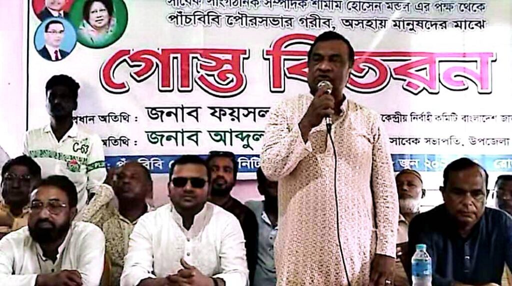 আল আমিন : ঈদুল আজহার ত্যাগের মহান আদর্শকে বাস্তবে রূপ দিতে জয়পুরহাটের পাঁচবিবিতে এক ব্যতিক্রমী মানবিক উদ্যোগ নিয়েছেন ছাত্রদলের সাবেক নেতা শামীম হোসেন মন্ডল। তিনি নিজ অর্থায়নে ১৭টি গরু কোরবানি দিয়ে পৌরসভার ৯টি ওয়ার্ডের ২ হাজার দরিদ্র ও অসহায় পরিবারে ১ কেজি করে মাংস বিতরণ করেছেন। রোববার (৮ জুন) বেলা ১১টায় পাঁচবিবি পৌর কমিউনিটি সেন্টারে আয়োজিত এ মাংস বিতরণ অনুষ্ঠানে প্রধান অতিথি হিসেবে উপস্থিত ছিলেন বাংলাদেশ জাতীয়তাবাদী দল (বিএনপি) কেন্দ্রীয় নির্বাহী কমিটির সদস্য ফয়সাল আলীম। বিশেষ অতিথি হিসেবে উপস্থিত ছিলেন:পাঁচবিবি উপজেলা বিএনপির সাবেক সভাপতি আব্দুল গফুর মন্ডল,সাবেক সাংগঠনিক সম্পাদক আবুল হোসেন মাস্টার, আটাপুর ইউনিয়ন বিএনপির সাবেক সভাপতি অধ্যক্ষ নওশাদ আলী মন্ডল,বালিঘাটা ইউনিয়ন বিএনপির সাবেক সাধারণ সম্পাদক প্রভাষক সাইদুর রহমান,উপজেলা যুবদলের সাবেক সভাপতি সামছুল হুদা দুলাল,যুব নেতা হারুনুর রশিদ সজল,ছাত্র নেতা সাজ্জাদুর রহমান সাজ্জাদ,