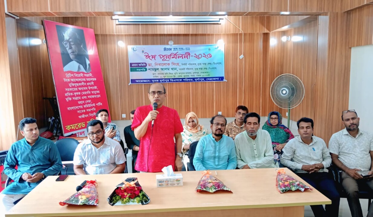 মোরশেদ আল দুর্গাপুর, নেত্রকোনা | ১১ জুন ২০২৫ আজ কমরেড মণি সিংহ স্মৃতি জাদুঘরের হলরুমে দুঃস্থ স্বাস্থ্য কেন্দ্র (ডিএসকে) দুর্গাপুর পরিবারের উদ্যোগে অনুষ্ঠিত হলো ‘ঈদ পুনর্মিলনী–২০২৫’। উৎসবমুখর এ আয়োজন ছিল ডিএসকে পরিবারের সদস্যদের মিলনমেলা। অনুষ্ঠানে প্রধান অতিথি হিসেবে উপস্থিত ছিলেন ডিএসকে’র নির্বাহী পরিচালক ডা. দিবালোক সিংহ। তিনি তার দিকনির্দেশনামূলক বক্তব্যে বলেন, “ডিএসকে প্রতিষ্ঠার ৩৬ বছর পূর্ণ হয়েছে। শুরু থেকেই এই প্রতিষ্ঠান মানবিক ও সামাজিক দায়িত্ববোধ নিয়ে গরিব-দুঃখী মেহনতি মানুষের পাশে দাঁড়িয়েছে। আমাদের ঐক্য, মূল্যবোধ এবং সমাজ পরিবর্তনে সক্রিয় ভূমিকা রাখার লক্ষ্যে সবাইকে একসাথে কাজ করতে হবে।” অনুষ্ঠানের সভাপতিত্ব করেন ডিএসকে নেত্রকোনা অঞ্চলের সহকারী পরিচালক শামছুল আলম খান এবং সঞ্চালনা করেন ডিএসকে রিসোর্স সেন্টারের ব্যবস্থাপক মোরশেদ আলম। অনুষ্ঠানে বিশেষ আলোচনায় অংশ নেন কমরেড মণি সিংহ স্মৃতি জাদুঘরের তত্ত্বাবধায়ক আলকাছ উদ্দিন মীর। এছাড়া মঞ্চে উপস্থিত ছিলেন ডিএসকে সহকারী পরিচালক আশরাফুল আলম সোহেল, আঞ্চলিক ব্যবস্থাপক নজরুল ইসলাম ও কাজল চন্দ্র সরকার, ডিএসকে দুর্গাপুর হাসপাতালের ব্যবস্থাপক ধ্রুব সরকার, সমৃদ্ধি কর্মসূচির সমন্বয়কারী রূপন কুমার সরকার, শাখা ব্যবস্থাপক সুলতানা শাহীন, আনোয়ারা বেগম, মজিবুর রহমান এবং কক্সবাজারে কর্মরত ডিএসকে’র টেকনিক্যাল ম্যানেজার শফিকুল ইসলাম সফিক। বক্তারা ডিএসকে পরিবারের সামাজিক দায়বদ্ধতা, স্বাস্থ্যসেবা ও কমিউনিটি উন্নয়নে ভূমিকার প্রশংসা করেন এবং ভবিষ্যতে আরও কার্যকর ও সমন্বিত উদ্যোগ গ্রহণের উপর গুরুত্বারোপ করেন। অনুষ্ঠানজুড়ে ছিল উষ্ণতা, সৌহার্দ্য ও আনন্দের আবহ। ডিএসকে পরিবারের সদস্যরা একত্রিত হয়ে ঈদের আনন্দ ভাগাভাগি করে নেওয়ার মধ্য দিয়ে অনুষ্ঠানটি আরও প্রাণবন্ত হয়ে ওঠে।