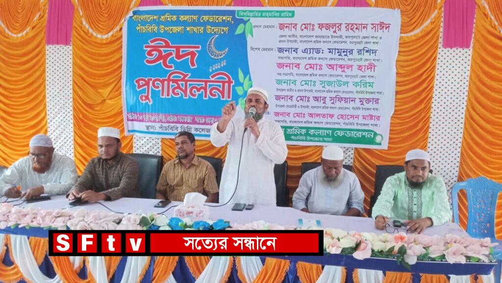 মোঃ আবু সুফিয়ান মুক্তার,জয়পুরহাট প্রতিনিধিঃ জয়পুরহাটের পাঁচবিবি উপজেলা শ্রমিক কল্যাণ ফেডারেশনের উদ্যোগে এক প্রাণবন্ত ঈদ পুনর্মিলনী ও মতবিনিময় সভা অনুষ্ঠিত হয়েছে। গতকাল দুপুরে পাঁচবিবি ডিগ্রী কলেজের হলরুমে আয়োজিত এ অনুষ্ঠানে উপজেলার বিভিন্ন ইউনিয়ন থেকে আগত শতাধিক শ্রমিক নেতাকর্মী অংশগ্রহণ করেন। জয়পুরহাট জেলা প্রতিনিধি মোঃ আবু সুফিয়ান মুক্তার এর পাঠানো তথ্য ও ভিডিও চিত্রে দেখুন বিস্তারিত-সভায় সভাপতিত্ব করেন পাঁচবিবি উপজেলা শ্রমিক কল্যাণ ফেডারেশনের সভাপতি মোঃ আলতাফ হোসেন মাষ্টার। অনুষ্ঠানটি সঞ্চালনা করেন ফেডারেশনের উপজেলা সেক্রেটারী মাওলানা মোঃ ছামসুল আলম মাষ্টার। অনুষ্ঠানে প্রধান অতিথি হিসেবে উপস্থিত ছিলেন বাংলাদেশ জামায়াতে ইসলামীর কেন্দ্রীয় মজলিসে শূরার অন্যতম সদস্য, জয়পুরহাট জেলা জামায়াতের আমীর এবং জয়পুরহাট-১ আসনের আসন্ন জাতীয় সংসদ নির্বাচনে এমপি পদপ্রার্থী ডাঃ ফজলুর রহমান সাঈদ। তিনি বলেন, শ্রমজীবী মানুষের উন্নয়ন ছাড়া জাতীয় উন্নয়ন সম্ভব নয়। আমরা একটি কল্যাণরাষ্ট্র গঠনে বিশ্বাস করি, যেখানে শ্রমিকরা তাদের প্রাপ্য অধিকার ও মর্যাদা পাবে ইনশাআল্লাহ। বিশেষ অতিথি হিসেবে বক্তব্য রাখেন জেলা জামায়াতে ইসলামীর সহকারী সেক্রেটারী ও শ্রমিককল্যান ফেডারেশনের জয়পুরহাট জেলা শাখার সভাপতি অ্যাডভোকেট মামুনুর রশিদ,জেলা শ্রমিক কল্যানের সহ-সভাপতি মোঃ আব্দুল হাদি, পাঁচবিবি উপজেলা জামায়াতে ইসলামীর আমীর ডাঃ মোঃ সুজাুল করিম,উপজেলা জামায়াতে ইসলামীর সেক্রেটারী মোঃ আবু সুফিয়ান (মুক্তার) এবং উপজেলা জামায়াতের অন্যতম কর্মপরিষদ সদস্য মাওলানা আবুল বাশার। তারা সবাই শ্রমিকদের জীবনের বাস্তবতা ও সমস্যার কথা তুলে ধরেন এবং শ্রমিক কল্যাণ ফেডারেশনের কার্যক্রমকে আরও বেগবান করার আহ্বান জানান। সবশেষে, অংশগ্রহণকারী শ্রমিক ও নেতৃবৃন্দ একসাথে দুপুরের খাবার গ্রহণের মাধ্যমে অনুষ্ঠানটির আনুষ্ঠানিক সমাপ্তি ঘোষণা করেন।
