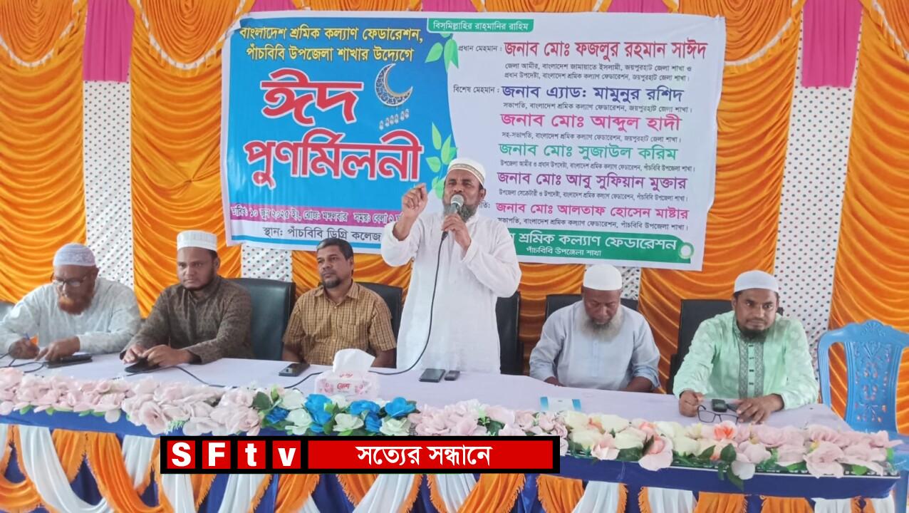 মোঃ আবু সুফিয়ান মুক্তার,জয়পুরহাট প্রতিনিধিঃ জয়পুরহাটের পাঁচবিবি উপজেলা শ্রমিক কল্যাণ ফেডারেশনের উদ্যোগে এক প্রাণবন্ত ঈদ পুনর্মিলনী ও মতবিনিময় সভা অনুষ্ঠিত হয়েছে। গতকাল দুপুরে পাঁচবিবি ডিগ্রী কলেজের হলরুমে আয়োজিত এ অনুষ্ঠানে উপজেলার বিভিন্ন ইউনিয়ন থেকে আগত শতাধিক শ্রমিক নেতাকর্মী অংশগ্রহণ করেন। জয়পুরহাট জেলা প্রতিনিধি মোঃ আবু সুফিয়ান মুক্তার এর পাঠানো তথ্য ও ভিডিও চিত্রে দেখুন বিস্তারিত-সভায় সভাপতিত্ব করেন পাঁচবিবি উপজেলা শ্রমিক কল্যাণ ফেডারেশনের সভাপতি মোঃ আলতাফ হোসেন মাষ্টার। অনুষ্ঠানটি সঞ্চালনা করেন ফেডারেশনের উপজেলা সেক্রেটারী মাওলানা মোঃ ছামসুল আলম মাষ্টার। অনুষ্ঠানে প্রধান অতিথি হিসেবে উপস্থিত ছিলেন বাংলাদেশ জামায়াতে ইসলামীর কেন্দ্রীয় মজলিসে শূরার অন্যতম সদস্য, জয়পুরহাট জেলা জামায়াতের আমীর এবং জয়পুরহাট-১ আসনের আসন্ন জাতীয় সংসদ নির্বাচনে এমপি পদপ্রার্থী ডাঃ ফজলুর রহমান সাঈদ। তিনি বলেন, শ্রমজীবী মানুষের উন্নয়ন ছাড়া জাতীয় উন্নয়ন সম্ভব নয়। আমরা একটি কল্যাণরাষ্ট্র গঠনে বিশ্বাস করি, যেখানে শ্রমিকরা তাদের প্রাপ্য অধিকার ও মর্যাদা পাবে ইনশাআল্লাহ। বিশেষ অতিথি হিসেবে বক্তব্য রাখেন জেলা জামায়াতে ইসলামীর সহকারী সেক্রেটারী ও শ্রমিককল্যান ফেডারেশনের জয়পুরহাট জেলা শাখার সভাপতি অ্যাডভোকেট মামুনুর রশিদ,জেলা শ্রমিক কল্যানের সহ-সভাপতি মোঃ আব্দুল হাদি, পাঁচবিবি উপজেলা জামায়াতে ইসলামীর আমীর ডাঃ মোঃ সুজাুল করিম,উপজেলা জামায়াতে ইসলামীর সেক্রেটারী মোঃ আবু সুফিয়ান (মুক্তার) এবং উপজেলা জামায়াতের অন্যতম কর্মপরিষদ সদস্য মাওলানা আবুল বাশার। তারা সবাই শ্রমিকদের জীবনের বাস্তবতা ও সমস্যার কথা তুলে ধরেন এবং শ্রমিক কল্যাণ ফেডারেশনের কার্যক্রমকে আরও বেগবান করার আহ্বান জানান। সবশেষে, অংশগ্রহণকারী শ্রমিক ও নেতৃবৃন্দ একসাথে দুপুরের খাবার গ্রহণের মাধ্যমে অনুষ্ঠানটির আনুষ্ঠানিক সমাপ্তি ঘোষণা করেন।