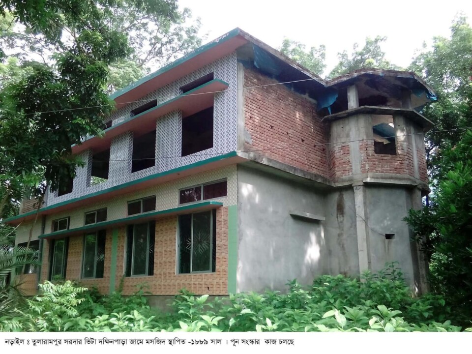 উজ্জ্বল রায়, জেলা প্রতিনিধি নড়াইল থেকে: বৃটিশদের শাসনামলে নির্মিত হয় তুলারামপুর সরদারভিটা জামে মসজিদ। উজ্জ্বল রায়, জেলা প্রতিনিধি নড়াইল থেকে জানান, তুলারমপুর ইউনিয়নের দ্বিতীয় পুরাতন মসজিদ এটি । এ আগে এ ইউনিয়নে তরফদার বাড়ি জামে মসজিদটি নির্মান হয় । যা শের শাহ শাসনামলে । তরফদার বাড়ি জামে মসজিদ নির্মানে অনুপ্রানিত হয়ে তুলারামপুর গ্রামের ধার্মিক ব্যক্তিত্ব দলিল উদ্দিন মোল্য ১৮৮৯ সালে ৪ শতক জমির উপর উপরে খড় ও চার পাশে মাটির ওয়াল করে ছোট পরিসরে এ মসজিদটি নির্মান হয় । পরবর্তীতে পাকিস্তান শাসনামলে স্থানীয় গ্রামবাসিদের সহযোগিতায় উপরে টিন এবং পাকা ওয়াল দিয়ে মসজিদটি সম্প্রসারণ করা হয় । এ সময় মসজিদটিতে ইমামসহ ২৭জন মুসল্লি নামায আদায় করতে পারতেন। তৎকালিন সময়ে জনবসতি কম থাকায় ২৭জন মুসল্লিকে শুক্রবার বাদে পাওয়া যেত না বলে এলাকার প্রবীনরা জানিয়েছেন। তারা আরো বলেছেন, ঘন বন জঙ্গলে ভরা এলাকাতে নির্মিত সে সময়কার মসজিদে মুসল্লিরা নামায আদায় করতে আসবেন এটা ভাবাই যেত না। পাকিস্তান শাসনামলে থেকে এ গ্রামে বসতি বাড়তে থাকে । বাড়তে থাকে মসজিদে এসে নামায আদায় করা মুসল্লিদের সংখ্যা । আবারও ২০০০ সালের দিক স্থাণীয় গ্রামবাসি মসজিদের প্রয়োজনীতা অনুভব করে সিদ্ধান্ত নেন মসজিদটি পূণঃনির্মানের জন্য । গ্রামবাসিদের সাহায্য-সহযোগিতায় ও পরে আরো ৩ শতক জমি বাড়িয়ে ৭শতক জমির উপর মসজিদটি একতলা ভবন নির্মান করা হয় । সর্বশেষ ২০১৮ সালের শুরুতে স্থাণীয় জনগন আবারও মসজিদটি দ্বিতল ভবন নির্মান কাজ করে । বর্তমানে মসজিদটির একতলার ফ্লোরে এবং বাইরের ওয়ালসহ বিভিন্ন স্থানে টাইলস স্থাপন করা হয়েছে । ইতিমধ্যে দ্বিতল ভবনের কাজ শুরু হয়েছে । মসজিদটি দ্বিতল ভবনের ওয়ালে চলছে টাইলস এর কাজ । মসজিদটির নির্মান কাজ শেষ এটি দর্শনীয় হয়ে উঠেছে বলে স্থানীয়রা জানান । তুলারামপুর দক্ষিনপাড়ার বাসিন্দা ব্যাংকার ইমদাদুল ইসলাম বলেন, আমাদের পুর্ব পুরুষ ছিলেন মসজিদ প্রতিষ্ঠাতা । মসজিদটি নির্মানের সময় এখানে অল্প জনবসতি ছিল । শুধু তাই নয় বর্ষা মৌসুমে পানিতে থৈথৈ করতো । এ কারনে উচু ভিটার উপর মসজিদটি নির্মান করা হয় । তিনি আরো বলেন মসজিদটি তুলারামপুর ইউনিয়নের দ্বিতীয় মসজিদ । মসজিদটির দ্বিতল ভবন নির্মান সম্পন্ন হলে ১’শ মুসল্লি এক সাথে নামায আদায় করতে পারবেন । বর্তমানে আমাদের ইউনিয়নে ৯টি মসজিদ নির্মান হলেও আমাদের মসজিদটি প্রতিষ্ঠাতা হয়ে বৃটিস শাসনামলে । আমার বাবা ও দাদা এ মসজিদে নামায আদায় করে গেছেন । আমি ও আমার সন্তান বর্তমানে নামায আদায় করছি । যা ভাগ্যের ব্যপার । তুলারামপুর ইউনিয়ন পরিষদ সাবেক চেয়ারম্যান বুলবুল আহম্মেদ বলেন, আমাদের বাড়ির পাশেই এ