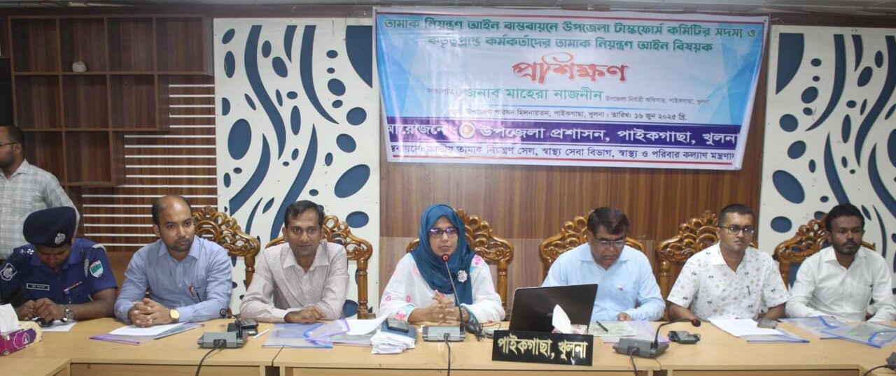 এম জালাল উদ্দীন:পাইকগাছা;;পাইকগাছায় তামাক নিয়ন্ত্রণ আইন বাস্তবায়নের লক্ষে উপজেলা টাস্কফোর্স কমিটির সদস্য ও কর্তৃত্বপ্রাপ্ত কর্মকর্তাদের প্রশিক্ষণ কর্মশালা অনুষ্ঠিত হয়েছে। সোমবার (১৬ জুন) সকালে উপজেলা পরিষদ মিলনায়তনে উপজেলা প্রশাসনের আয়োজনে এবং জাতীয় তামাক নিয়ন্ত্রণ সেল, স্বাস্থ্য সেবা বিভাগ ও স্বাস্থ্য ও পরিবার কল্যাণ মন্ত্রণালয়ের বাস্তবায়নে এ প্রশিক্ষণ অনুষ্ঠিত হয়। অনুষ্ঠানে উপজেলা নির্বাহী অফিসার মাহেরা নাজনীন এর সভাপতিত্বে ও সহকারী কমিশনার (ভূমি) ইফতেখারুল ইসলাম শামীম এর সঞ্চালনায় বক্তব্য রাখেন পাইকগাছা সরকারি কলেজের অধ্যক্ষ সমরেশ রায়, সিনিয়র মৎস্য কর্মকর্তা সৈকত মল্লিক, উপজেলা কৃষি কর্মকর্তা কৃষিবিদ একরামুল ইসলাম, প্রাণিসম্পদ কর্মকর্তা ডা. পার্থ প্রতিম রায়। সময়ে অন্যদের মধ্যে উপস্থিত ছিলেন, শিক্ষা অফিসার বিদ্যুৎ রঞ্জন সাহা, মেডিকেল অফিসার ডা. ইব্রাহিম, মহিলা বিষয়ক কর্মকর্তা রেশমা আক্তার, স্যানিটারি ইন্সপেক্টর উদয় মণ্ডল, সহকারী যুব উন্নয়ন কর্মকর্তা বাবলুর রহমান, এসআই নুরে আলম, গড়ইখালী ইউপি চেয়ারম্যান আব্দুস সালাম কেরু, লস্কর ইউনিয়নের ভারপ্রাপ্ত চেয়ারম্যান মোঃ জাহাঙ্গীর আলম সানা, দেলুটি ইউপির ভারপ্রাপ্ত চেয়ারম্যান সুকুমার কবিরাজ, শেখ খোরশেদুজ্জামান, সিএ আব্দুল বারী সহ বিভিন্ন দপ্তরের কর্মকর্তা, শিক্ষা প্রতিষ্ঠান প্রধান, জনপ্রতিনিধি ও সুশীল সমাজের প্রতিনিধি বৃন্দ।