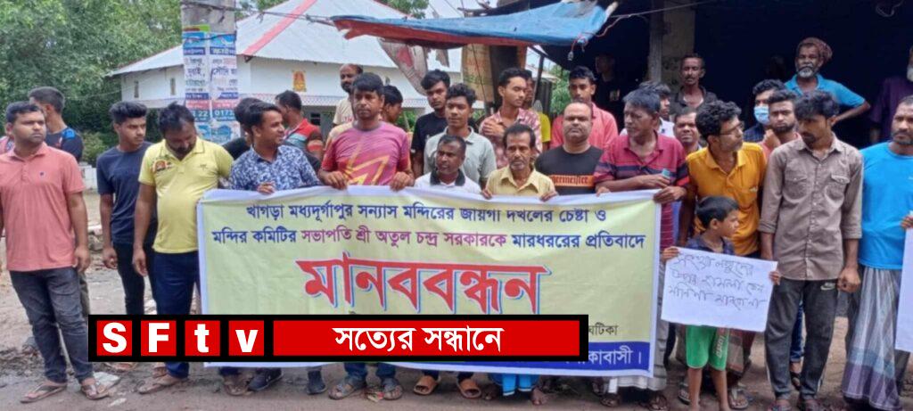 মঙ্গলবার বেলা সাড়ে ১১টার দিকে খাগড়া মধ্যে দুর্গাপুর বাজরে মন্দিরের সামনে এলাকাবাসী ও মন্দির কমিটির ব্যানারে এই মানববন্ধন অনুষ্ঠিত হয়।