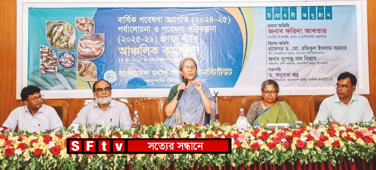 শনিবার (২১ জুন ২০২৫) সকালে ময়মনসিংহে বাংলাদেশ মৎস্য গবেষণা ইনস্টিটিউট (বিএফআরআই) আয়োজিত “বার্ষিক গবেষণা অগ্রগতি (২০২৪-২৫) পর্যালোচনা ও গবেষণা পরিকল্পনা (২০২৫-২৬)” শীর্ষক আঞ্চলিক কর্মশালার উদ্বোধনী অনুষ্ঠানে প্রধান অতিথির বক্তব্যে তিনি এসব কথা বলেন।