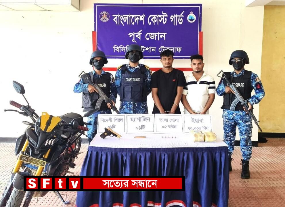 সুত্র জানায়,গত ২৩জুন ২০২৫ইং রাত ১১টায় কোস্ট গার্ড স্টেশন টেকনাফ গোপন সংবাদের ভিত্তিতে টেকনাফ থানাধীন কেরুনতলী এলাকায় একটি বিশেষ অভিযানে যায়। অভিযানকালীন উক্ত এলাকায় একটি মোটর সাইকেলের গতিবিধি সন্দেহজনক মনে হলে কোস্ট গার্ড আভিযানিক দল কর্তৃক মোটর সাইকেলের চালক ও আরোহী হ্নীলা জাদিমোরার শফি উল্লাহর পুত্র মোঃ মিজানুর রহমান (২০) এবং দমদমিয়ার আইয়ুবের পুত্র মোঃ একরাম (২৬) মোটর সাইকেলটি থামানো হয়। পরে মোটর সাইকেল আরোহীর কাছে রক্ষিত ব্যাগ তল্লাশী করে ২০হাজার পিস ইয়াবা এবং মোটর সাইকেল চালকের দেহ তল্লাশী করে কোমর হতে ১টি (৭.৬৫ মিঃ মিঃ) বিদেশী পিস্তল,১টি পিস্তলের ম্যাগাজিন ও ৫ রাউন্ড তাজা গোলাসহ মাদক পাচারকারী দ্বয়কে আটক করা হয়।