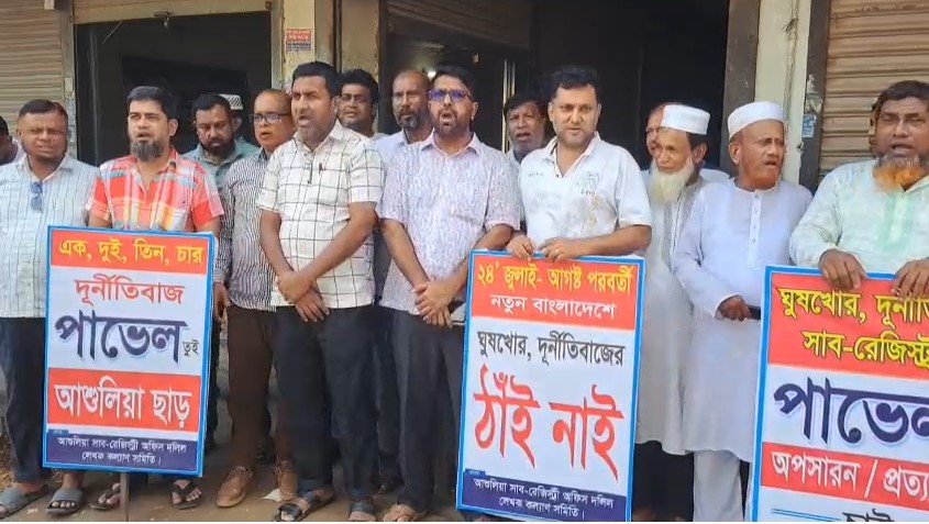 বিস্তারিত তথ্য চিত্রে মোঃ আসিফুজ্জামান আসিফ ঘুষ ও দুর্নীতির অভিযোগে আশুলিয়ার সাব রেজিস্ট্রার খায়রুল বাশার ভুইয়া পাভেলের পদত্যাগ দাবিতে টানা নয়দিন কর্মবিরতি ও বিক্ষোভ করছে দলিল লেখক কল্যাণ সমিতি। ফলে আশুলিয়া সাব রেজিস্ট্রি অফিসে রেজিস্ট্রেশন কার্যক্রম বন্ধ রয়েছে, সরকারের রাজস্ব হারাচ্ছে কোটি টাকা। সমিতির আহ্বায়ক আলমগীর হোসেন বলেন, খায়রুল বাশার ঘুষ ছাড়া দলিলে স্বাক্ষর করেন না। তাই তার অপসারণ দাবি করছি। অন্যদিকে, সব অভিযোগ অস্বীকার করে সাব রেজিস্ট্রার পাভেল বলেন, “একটি পক্ষ আমার সুনাম ক্ষুণ্ণ করতে অপপ্রচার চালাচ্ছে।”