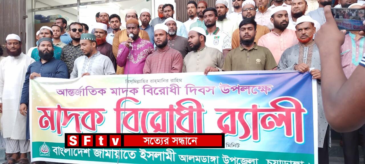 ড়ে ৫টার সময় বাংলাদেশ জামায়াতে ইসলামী আলমডাঙ্গা উপজেলা, পৌর ও জিএ শাখার উদ্যোগে যুব বিভাগের সভাপতি তরিকুল ইসলামের নেতৃত্বে যুব দায়িত্বশীলদের নিয়ে আলমডাঙ্গা উপজেলা মডেল মসজিদের সামনে থেকে বের হয়ে শহরের প্রধান প্রধান সড়ক প্রদক্ষিণ শেষে আলতায়েবা মোড়ে এসে সংক্ষিপ্ত সমাবেশ অনুষ্ঠিত হয়। উক্তর্্যালীতে প্রধান অতিথি হিসেবে উপস্থিত ছিলেন চুয়াডাঙ্গা জেলা যুব বিভাগের সভাপতি শেখ নূর মোহাম্মদ হুসাইন টিপু। বিশেষ অতিথি হিসেবে ছিলেন জেলা আইন ও আদালত বিষয়ক সম্পাদক দারুস সালাম, সেক্রেটারি আরিফুল ইসলাম, শ্রমিক বিভাগের সেক্রেটারি কাইয়ুম উদ্দিন হীরক, আলমডাঙ্গা পৌর আমীর মাহের আলী। ছাত্রশিবিরের আলমডাঙ্গা উপজেলা সভাপতি আখতারুজ্জামান, পৌর যুব বিভাগের সভাপতি সাইফুল্লাহ। সঞ্চালনায় ছিলেন উপজেলা সেক্রেটারি মামুন রেজা।