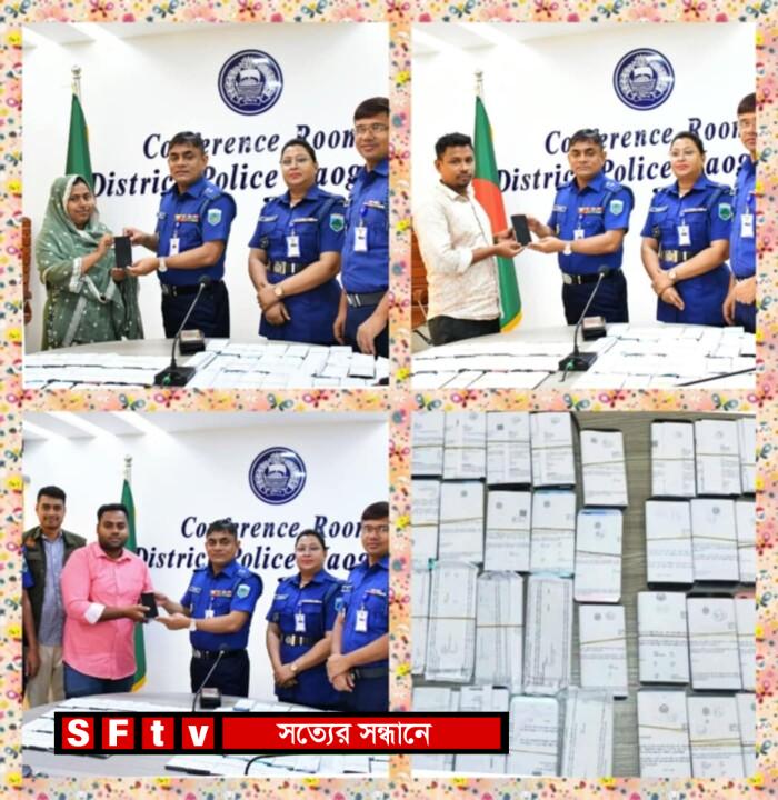 ২৯ জুন ২০২৫ রবিবার নওগাঁ পুলিশ সুপারের কার্যালয়ের সম্মেলন কক্ষে পুলিশ সুপার জনাব মোহাম্মদ সাফিউল সারোয়ার বিপিএম মহোদয় নওগাঁ জেলা পুলিশ কর্তৃক উদ্ধারকৃত ৭৫টি হারানো মোবাইল ফোন যাচাই-বাছাই করে প্রকৃত মালিকদের নিকট হস্তান্তর করেন।