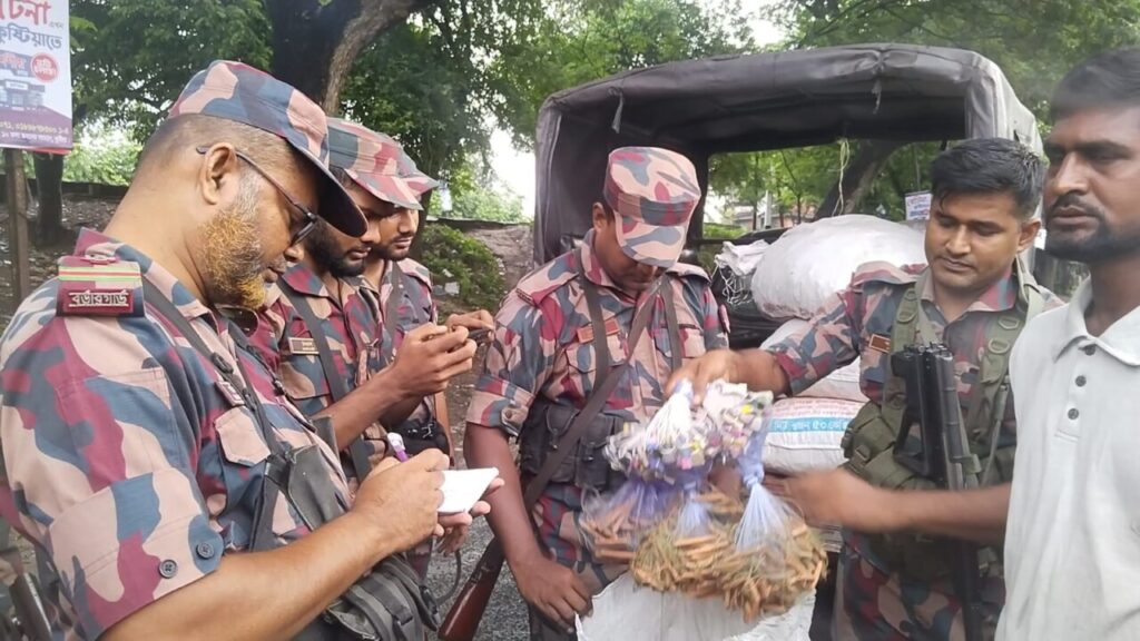 চুয়াডাঙ্গার আলমডাঙ্গা পৌর এলাকার রেলস্টেশন সংলগ্ন সাইকেল স্ট্যান্ড থেকে ছয় বস্তা অবৈধ কারেন্ট জাল উদ্ধার করেছে বর্ডার গার্ড বাংলাদেশ (বিজিবি)। বুধবার (২ জুলাই) ভোর ৬টার দিকে গোপন সংবাদের ভিত্তিতে বিজিবি-৬ এর একটি টহল দল এ অভিযান পরিচালনা করে। প্রাপ্ত তথ্যে জানা যায়, মঙ্গলবার সন্ধ্যায় এক অজ্ঞাত ব্যক্তি আলমডাঙ্গা রেলস্টেশনের খায়রুলের সাইকেল স্ট্যান্ডে ছয় বস্তা কারেন্ট জাল রেখে যায়। ধারণা করা হচ্ছে, ওই ব্যক্তি এগুলো আলমডাঙ্গা পশুহাটে বিক্রির উদ্দেশ্যে রেখে গিয়েছিল। গোপন সূত্রে খবর পেয়ে বিজিবি সদস্যরা তাৎক্ষণিকভাবে অভিযান চালিয়ে ছয় বস্তা অবৈধ কারেন্ট জাল জব্দ করে। তবে অভিযানে কাউকে আটক করা সম্ভব হয়নি। উদ্ধারকৃত জাল চুয়াডাঙ্গা সদর দপ্তরে নিয়ে যাওয়া হয়েছে। বিজিবির পক্ষ থেকে জানানো হয়েছে, ঘটনার সঙ্গে জড়িতদের শনাক্ত করতে তদন্ত শুরু হয়েছে। স্থানীয় জনগণ বিজিবির এই তৎপরতাকে স্বাগত জানিয়েছে এবং অবৈধ কর্মকাণ্ড দমনে প্রশাসনের আরও কঠোর পদক্ষেপ কামনা করেছেন।