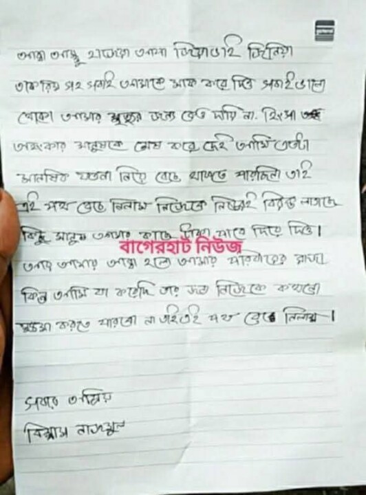 মরদেহের পাশ থেকে উদ্ধার হওয়া চিরকুটে লেখা রয়েছে, “আব্বা, আম্মা, হাজেলা আপা, জিয়া ভাই, জিনিয়া তারকরিমসহ সবাই আমাকে মাফ করে দিও, সবাই ভাল থেকো, আমার মৃত্যুর জন্য কেহ দায়ি না। হিংসা অহংকার মানুষকে শেষ করে দেয়। আমি ততটা মানুষিক যন্ত্রণা নিয়ে বেঁচে থাকতে পারছি না, তাই এই পথ বেছে নিলাম। নিজেকে নিজেই বিরক্ত লাগছে, কিছু মানুষ আমার কাছে টাকা পাবে দিয়ে দিও। আর আমার আব্বা হলো পরিবারের রাজা, কিন্তু আমি যা করেছি তার জন্য নিজেকে কখনো ক্ষমা করতে পারবো না। তাই এই পথ বেছে নিলাম।” সবার অপ্রিয় বিশ্বাস নাজমুল।