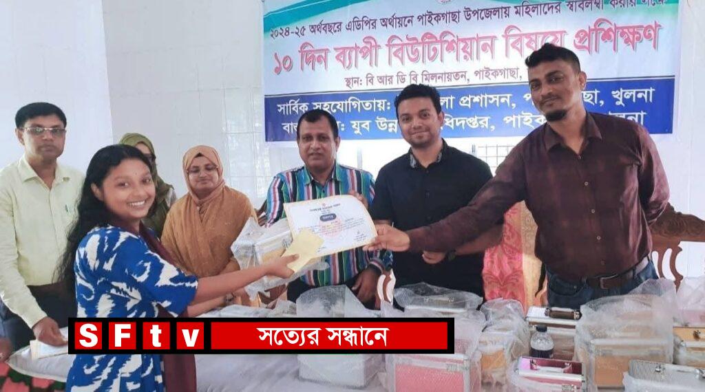 পাইকগাছা(খুলনা)প্রতিনিধি: পাইকগাছায় ২০২৪-২৫ অর্থবছরে এডিপির অর্থায়নে উপজেলায় মহিলাদের আত্মকর্মসংস্থান সৃষ্টির লক্ষ্যে ১০ দিন ব্যাপী বিউটিফিকেশন বিষয়ক প্রশিক্ষণের সমাপনীতে পুরস্কার ও সনদ বিতরণ করা হয়েছে।