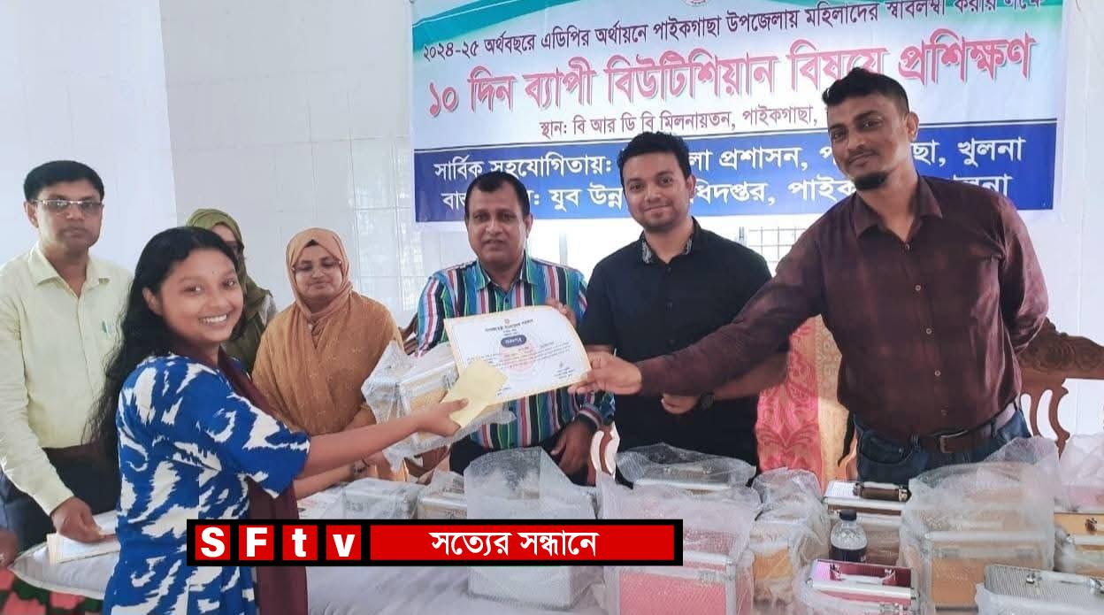 পাইকগাছা(খুলনা)প্রতিনিধি: পাইকগাছায় ২০২৪-২৫ অর্থবছরে এডিপির অর্থায়নে উপজেলায় মহিলাদের আত্মকর্মসংস্থান সৃষ্টির লক্ষ্যে ১০ দিন ব্যাপী বিউটিফিকেশন বিষয়ক প্রশিক্ষণের সমাপনীতে পুরস্কার ও সনদ বিতরণ করা হয়েছে।