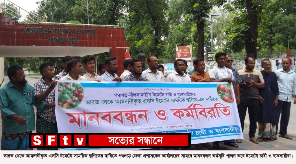 পঞ্চগড় প্রতিনিধি: ভারত থেকে আমদানীকৃত এলসি টমেটো আনা স্থগিতের দাবিতে পঞ্চগড়ে মানববন্ধন করেছে টমেটো চাষী ও ব্যবসায়ীরা। শনিবার দুপুরে পঞ্চগড় জেলা প্রশাসকের কার্যালয়ের সামনে পঞ্চগড়-নীলফামারী’র টমেটো চাষী ও ব্যবসায়ীদের ব্যানারে ওই মানববন্ধন কর্মসূচি পালন করা হয়।
