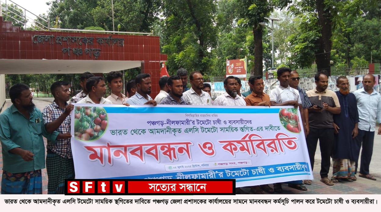 পঞ্চগড় প্রতিনিধি: ভারত থেকে আমদানীকৃত এলসি টমেটো আনা স্থগিতের দাবিতে পঞ্চগড়ে মানববন্ধন করেছে টমেটো চাষী ও ব্যবসায়ীরা। শনিবার দুপুরে পঞ্চগড় জেলা প্রশাসকের কার্যালয়ের সামনে পঞ্চগড়-নীলফামারী’র টমেটো চাষী ও ব্যবসায়ীদের ব্যানারে ওই মানববন্ধন কর্মসূচি পালন করা হয়।