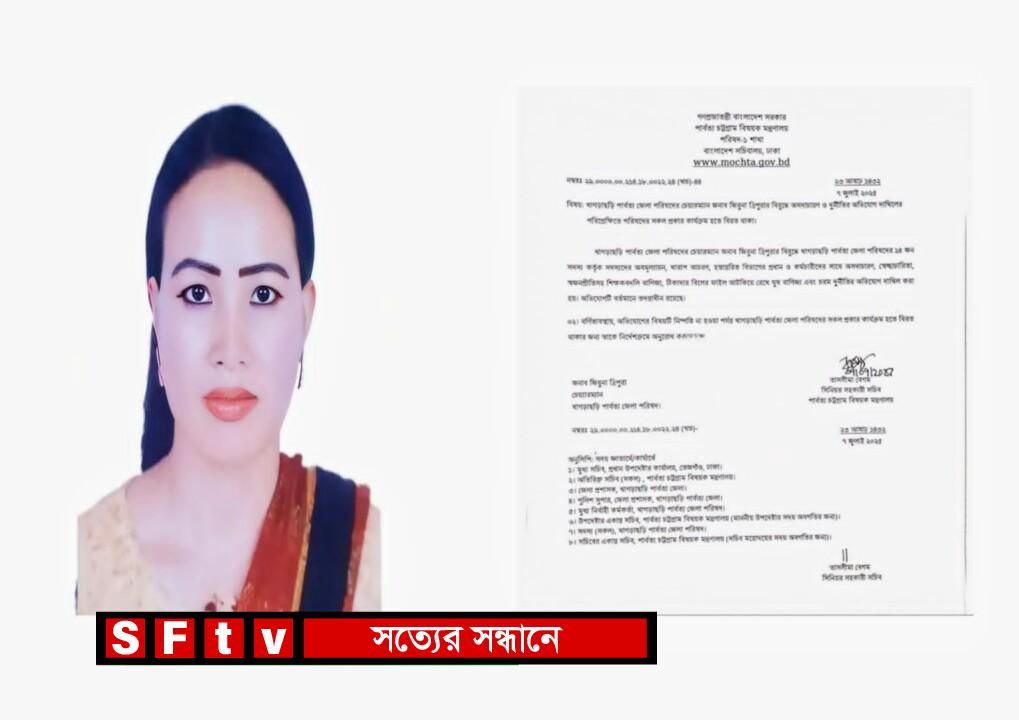 অভিযোগটি বর্তমানে তদন্তাধীন রয়েছে। বর্ণিতাবস্তায়, অভিযোগের বিষয়টি নিষ্পত্তি না হওয়া পর্যন্ত খাগড়াছড়ি পার্বত্য জেলা পরিষদের চেয়ারম্যান জিরুনা ত্রিপুরাকে পরিষদের সকল প্রকার কার্যক্রম হতে বিরত থাকার নিদের্শক্রমে অনুরোধ করা হলো।