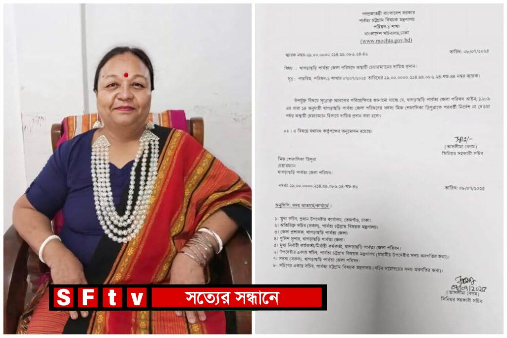 বিকেলে জারি করা এক পরিপত্রে জানানো হয়, খাগড়াছড়ি পার্বত্য জেলা পরিষদ আইন, ১৯৮৯ এর ধারা ১৪ অনুযায়ী শেফালিকা ত্রিপুরাকে পরবর্তী নির্দেশ না দেওয়া পর্যন্ত অস্থায়ী চেয়ারম্যান হিসেবে দায়িত্ব পালনের নির্দেশ দেওয়া হয়েছে।