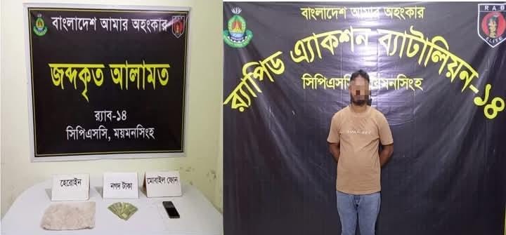 আবুল কালাম আজাদ ; ময়মনসিংহ জেলার ভালুকা থানা এলাকায় অভিযান চালিয়ে ২৬০ গ্রাম হেরোইনসহ একজন মাদক কারবারিকে গ্রেপ্তার করেছে র্যাব-১৪, ময়মনসিংহ-এর সিপিএসসি কোম্পানির একটি আভিযানিক দল। র্যাব সূত্রে জানা যায়, বৃহস্পতিবার ( ১০ জুলাই ২০২৫) ভোর সাড়ে ৫টার দিকে ভালুকা বাজার বাসস্ট্যান্ড সংলগ্ন “বায়তুল ফালাহ্ জামে মসজিদ” এর সামনে ঢাকা-ময়মনসিংহ মহাসড়কে চেকপোস্ট স্থাপন করে র্যাব সদস্যরা। এ সময় সন্দেহভাজন মোঃ জুয়েল রানা (৩৫), পিতা- মৃত নুরুল ইসলাম, সাং- নয়াগোলা উত্তর ভবানীপুর, থানা- চাপাইনবাবগঞ্জ সদর, জেলা- চাপাইনবাবগঞ্জ-কে তল্লাশি চালিয়ে আটক করা হয়। তল্লাশিকালে তার কাছ থেকে ২৬০ (দুইশত ষাট) গ্রাম হেরোইন উদ্ধার করা হয়, যার বাজারমূল্য আনুমানিক ২৬ লক্ষ টাকা বলে জানিয়েছে র্যাব। গ্রেপ্তারকৃত আসামির বিরুদ্ধে মাদকদ্রব্য নিয়ন্ত্রণ আইনে মামলা দায়ের করে তাকে ময়মনসিংহ জেলার ভালুকা মডেল থানায় হস্তান্তর করা হয়েছে। র্যাবের পক্ষ থেকে জানানো হয়, দেশের মাদক নির্মূলে এ ধরনের অভিযান অব্যাহত থাকবে।