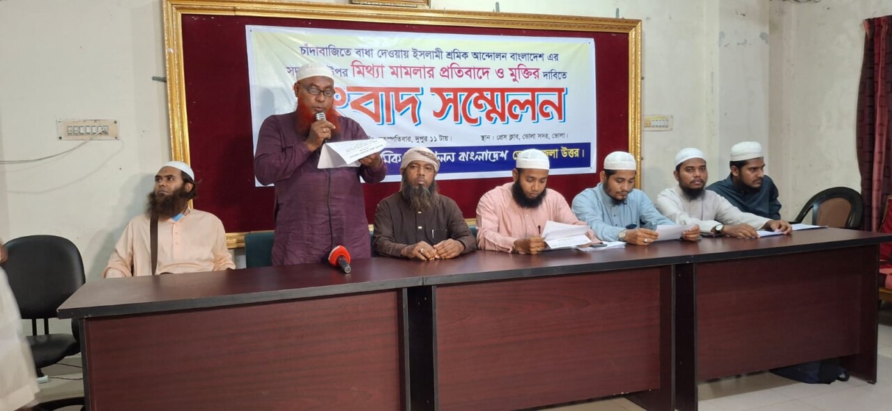 ইসলামী আন্দোলনের কর্মীর মুক্তি ও থানার ওসি অপসারণ দাবিতে ভোলায় সংবাদ সম্মেলন।