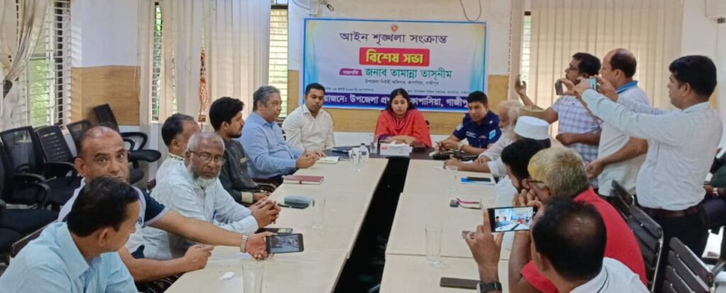প্রতিনিধি, মোঃ মিন্টু: গাজীপুরের কাপাসিয়া উপজেলা প্রশাসনের উদ্যোগে আইন শৃঙ্গলা সংক্রান্ত বিশেষ সভা অনুষ্ঠিত হয়েছে। ১০ জুলাই বৃহস্পতিবার সকালে উপজেলা পরিষদ সভাকক্ষে আয়োজিত সভায় সভাপতিত্ব করেন উপজেলা নির্বাহী অফিসার (ইউএনও) ডাঃ তামান্না তাসনীম। এসময় অন্যান্যের মাঝে উপস্থিত থেকে মতামত প্রকাশ করেন সহকারী কমিশনার (ভূমি) মোঃ নূরুল আমিন, কাপাসিয়া থানার অফিসার ইনচার্জ (ওসি) জয়নাল আবেদীন মন্ডল, গাজীপুর জেলা বিএনপির যুগ্ম আহ্বায়ক ও কাপাসিয়া উপজেলা বিএনপির আহ্বায়ক শাহ রিয়াজুল হান্নান, উপজেলা বিএনপির সদস্য সচিব বীর মুক্তিযোদ্ধা খন্দকার আজিজুর রহমান পেরা, জামায়াতের কেন্দ্রীয় কর্মপরিষদ সদস্য মাওলানা শেফাউল হক, উপজেলা জামায়াতের সভাপতি ফরহাদ হোসেন মোল্লা, এনসিপি নেতা আব্দুল্লাহ আল মুহিন, কাপাসিয়া প্রেসক্লাবের সভাপতি এফ এম কামাল হোসেন, উপজেলা দুর্নীতি প্রতিরোধ কমিটির সাধারণ সম্পাদক সাংবাদিক সাইফুল ইসলাম শাহীন, ছাত্র প্রতিনিধি মোঃ রাশেদ, সাংবাদিক সঞ্জীব কুমার দাস, জাকির হোসেন কামাল, প্রেসক্লাব সাধারণ সম্পাদক অধ্যাপক মোঃ শামসুল হুদা লিটন, আকরাম হোসেন রিপন, সফিউদ্দিন জিন্নাহ, বেলায়েত হোসেন শামীম প্রমুখ । আইনশৃঙ্গলা সংক্রান্ত বিশেষ সভায় কাপাসিয়া সদর রোড়ে প্রায় সময়েই লেগে থাকা দীর্ঘ যানজট, মাদকমুক্ত সমাজ গঠনন, সন্ত্রাস নির্মূল, ইভটিজিং বন্ধ, কিশোর গ্যাং প্রতিরোধ, কিশোর মোটরবাইকারদের সচেতনতা বৃদ্ধি, গরু চুরি রোধ, ফেক আইডি থেকে অপপ্রচার রোধ করা। বিশেষ করে সাম্প্রতিক সময়ে বেশ উপজেলার বিভিন্ন স্থানে কয়েকটা অস্বাভাবিক হত্যাকান্ডের প্রকৃত রহস্য উন্মোচন। জড়িতদের বিরুদ্ধে ব্যবস্থা নেয়া সহ নানাবিধ বিষয় নিয়ে বিস্তারিত আলোচনা করা হয়। প্রতিনিধিত্বশীল সমাজ ব্যবস্থায় দায়বদ্ধতার জায়গা থেকে আইনশৃঙ্গলা রক্ষার্থে সবাইকে ঐক্যবদ্ধভাবে সহযোগিতার আহ্বান জানানো হয়। একটি বিশেষ গোষ্ঠী উদ্দেশ্যমূলক ভাবে হত্যাকান্ড সহ বিভিন্ন অপকর্মের দায় বিশেষ একটি রাজনৈতিক দলের উপর চাপিয়ে দিয়ে চরিত্রহননের তীব্র নিন্দা ও প্রতিবাদ জানানো হয়।