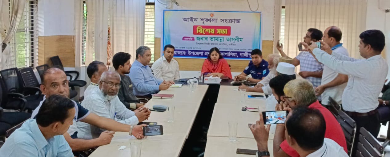 প্রতিনিধি, মোঃ মিন্টু: গাজীপুরের কাপাসিয়া উপজেলা প্রশাসনের উদ্যোগে আইন শৃঙ্গলা সংক্রান্ত বিশেষ সভা অনুষ্ঠিত হয়েছে। ১০ জুলাই বৃহস্পতিবার সকালে উপজেলা পরিষদ সভাকক্ষে আয়োজিত সভায় সভাপতিত্ব করেন উপজেলা নির্বাহী অফিসার (ইউএনও) ডাঃ তামান্না তাসনীম। এসময় অন্যান্যের মাঝে উপস্থিত থেকে মতামত প্রকাশ করেন সহকারী কমিশনার (ভূমি) মোঃ নূরুল আমিন, কাপাসিয়া থানার অফিসার ইনচার্জ (ওসি) জয়নাল আবেদীন মন্ডল, গাজীপুর জেলা বিএনপির যুগ্ম আহ্বায়ক ও কাপাসিয়া উপজেলা বিএনপির আহ্বায়ক শাহ রিয়াজুল হান্নান, উপজেলা বিএনপির সদস্য সচিব বীর মুক্তিযোদ্ধা খন্দকার আজিজুর রহমান পেরা, জামায়াতের কেন্দ্রীয় কর্মপরিষদ সদস্য মাওলানা শেফাউল হক, উপজেলা জামায়াতের সভাপতি ফরহাদ হোসেন মোল্লা, এনসিপি নেতা আব্দুল্লাহ আল মুহিন, কাপাসিয়া প্রেসক্লাবের সভাপতি এফ এম কামাল হোসেন, উপজেলা দুর্নীতি প্রতিরোধ কমিটির সাধারণ সম্পাদক সাংবাদিক সাইফুল ইসলাম শাহীন, ছাত্র প্রতিনিধি মোঃ রাশেদ, সাংবাদিক সঞ্জীব কুমার দাস, জাকির হোসেন কামাল, প্রেসক্লাব সাধারণ সম্পাদক অধ্যাপক মোঃ শামসুল হুদা লিটন, আকরাম হোসেন রিপন, সফিউদ্দিন জিন্নাহ, বেলায়েত হোসেন শামীম প্রমুখ । আইনশৃঙ্গলা সংক্রান্ত বিশেষ সভায় কাপাসিয়া সদর রোড়ে প্রায় সময়েই লেগে থাকা দীর্ঘ যানজট, মাদকমুক্ত সমাজ গঠনন, সন্ত্রাস নির্মূল, ইভটিজিং বন্ধ, কিশোর গ্যাং প্রতিরোধ, কিশোর মোটরবাইকারদের সচেতনতা বৃদ্ধি, গরু চুরি রোধ, ফেক আইডি থেকে অপপ্রচার রোধ করা। বিশেষ করে সাম্প্রতিক সময়ে বেশ উপজেলার বিভিন্ন স্থানে কয়েকটা অস্বাভাবিক হত্যাকান্ডের প্রকৃত রহস্য উন্মোচন। জড়িতদের বিরুদ্ধে ব্যবস্থা নেয়া সহ নানাবিধ বিষয় নিয়ে বিস্তারিত আলোচনা করা হয়। প্রতিনিধিত্বশীল সমাজ ব্যবস্থায় দায়বদ্ধতার জায়গা থেকে আইনশৃঙ্গলা রক্ষার্থে সবাইকে ঐক্যবদ্ধভাবে সহযোগিতার আহ্বান জানানো হয়। একটি বিশেষ গোষ্ঠী উদ্দেশ্যমূলক ভাবে হত্যাকান্ড সহ বিভিন্ন অপকর্মের দায় বিশেষ একটি রাজনৈতিক দলের উপর চাপিয়ে দিয়ে চরিত্রহননের তীব্র নিন্দা ও প্রতিবাদ জানানো হয়।