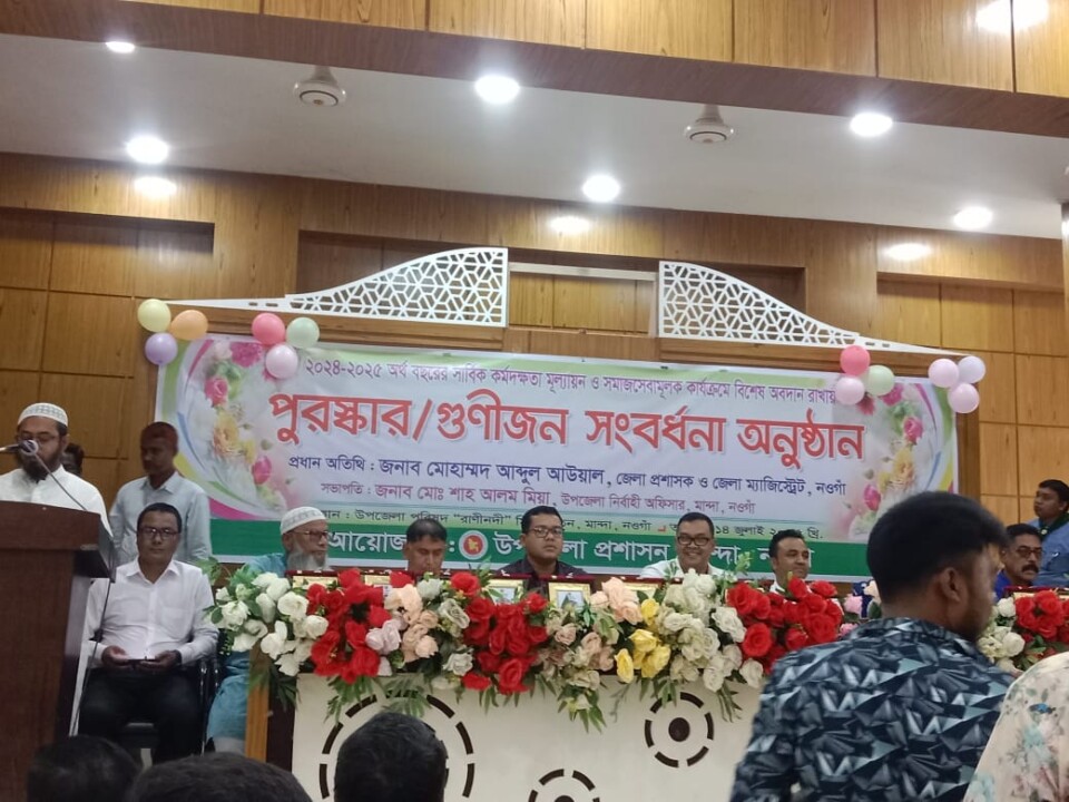 মান্দা উপজেলা পরিষদের রানী নদী মিলনায়তনে আজ সোমবার (১৪ জুলাই) বর্ণাঢ্য আয়োজনের মধ্য দিয়ে অনুষ্ঠিত হয়েছে “পুরস্কার বিতরণ ও গুণীজন সংবর্ধনা” অনুষ্ঠান।অনুষ্ঠানে সভাপতিত্ব করেন মান্দা উপজেলা নির্বাহী অফিসার শাহ আলম মিয়া। সঞ্চালনার দায়িত্বে ছিলেন উপজেলা প্রকল্প বাস্তবায়ন কর্মকর্তা আরিফুল ইসলাম।অনুষ্ঠানে প্রধান অতিথি হিসেবে উপস্থিত ছিলেন নওগাঁ জেলা প্রশাসক ও জেলা ম্যাজিস্ট্রেট আব্দুল আউয়াল।বিশেষ অতিথি হিসেবে উপস্থিত ছিলেন উপজেলা প্রাণিসম্পদ কর্মকর্তা নুরুজ্জামান এবং মান্দা থানার ভারপ্রাপ্ত কর্মকর্তা মনসুর রহমান।অনুষ্ঠানে আরও উপস্থিত ছিলেন বিএনপির সাবেক সভাপতি মোখলেছুর রহমান মাকে, সাবেক উপজেলা চেয়ারম্যান ইকরামুল বারি টিপু, থানা বিএনপির সাধারণ সম্পাদক শফিকুল ইসলাম চৌধুরী বাবুলসহ বিভিন্ন রাজনৈতিক, সামাজিক ও সাংস্কৃতিক সংগঠনের নেতৃবৃন্দ। এছাড়া উপজেলার বিভিন্ন দপ্তরের কর্মকর্তা-কর্মচারীবৃন্দ, বিএনপি ও জামায়াতের অঙ্গ ও সহযোগী সংগঠনের নেতারা এবং প্রিন্ট ও ইলেকট্রনিক মিডিয়ার সাংবাদিকবৃন্দ অনুষ্ঠানে উপস্থিত ছিলেন।গুণীজন সংবর্ধনা অনুষ্ঠানে বিভিন্ন ক্ষেত্রে অবদান রাখার জন্য একাধিক ব্যক্তিকে সম্মাননা প্রদান করা হয়।