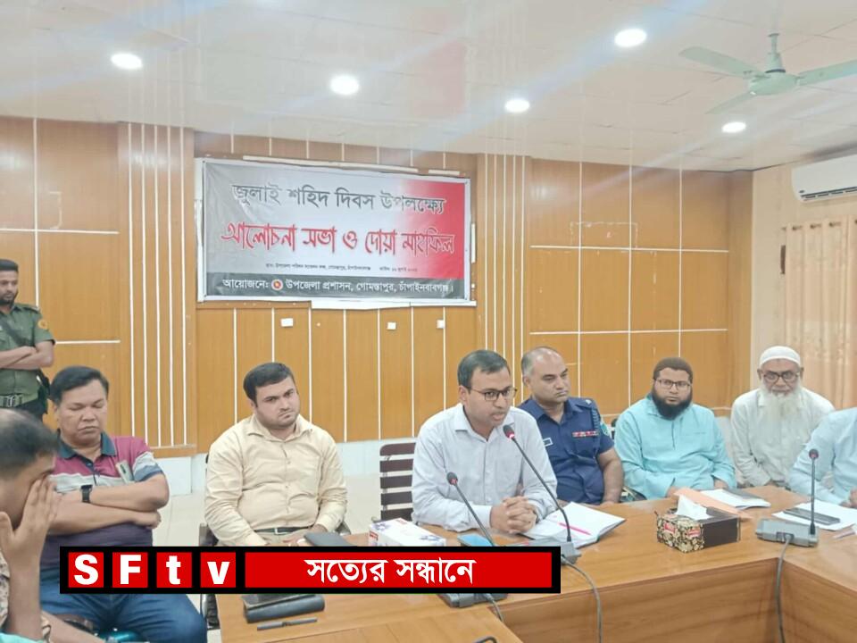মোঃ রনি রজব ভোলাহাট উপজেলা (প্রতিনিধি): জুলাই শহীদ দিবস উপলক্ষে চাঁপাইনবাবগঞ্জে গোমস্তাপুরে আলোচনা সভা ও দোয়া মাহফিল আয়োজন করা হয়। বুধবার(১৬ জুন) সকাল এগারোটায় উপজেলা সভাকক্ষে,