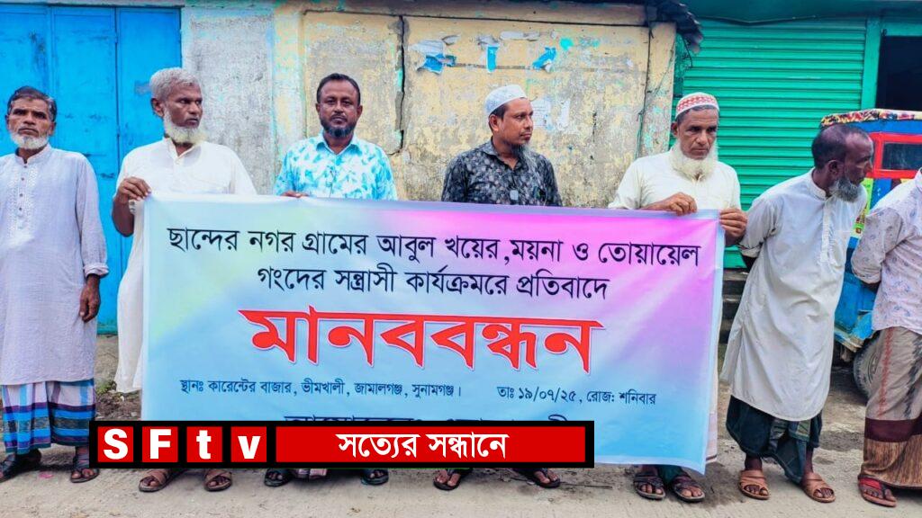 মো. শাহীন আলম, সুনামগঞ্জ প্রতিনিধি: সুনামগঞ্জের জামালগঞ্জ উপজেলার ভীমখালি ইউনিয়নের কারেন্টের বাজারে রবিবার (২০ জুলাই) দুপুর ১২টায় চান্দেরনগর গ্রামের ভুক্তভোগী পরিবার ও আশপাশের এলাকার মানুষ মানববন্ধনে অংশ নেন। সম্প্রতি একের পর এক সন্ত্রাসী হামলার প্রতিবাদে এই মানববন্ধনের আয়োজন করা হয়।