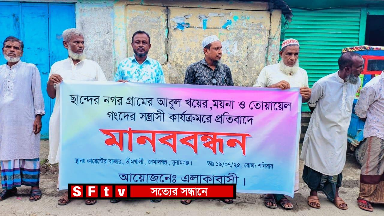মো. শাহীন আলম, সুনামগঞ্জ প্রতিনিধি: সুনামগঞ্জের জামালগঞ্জ উপজেলার ভীমখালি ইউনিয়নের কারেন্টের বাজারে রবিবার (২০ জুলাই) দুপুর ১২টায় চান্দেরনগর গ্রামের ভুক্তভোগী পরিবার ও আশপাশের এলাকার মানুষ মানববন্ধনে অংশ নেন। সম্প্রতি একের পর এক সন্ত্রাসী হামলার প্রতিবাদে এই মানববন্ধনের আয়োজন করা হয়।