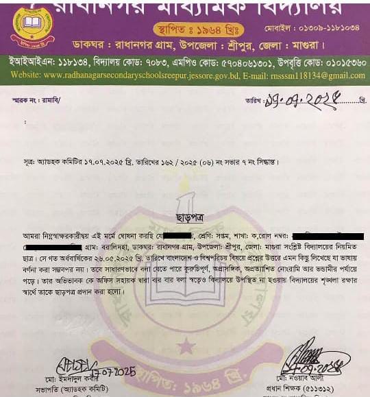 এ ঘটনায় স্কুলটির এ্যাডহক কমিটির সভাপতি এমদাদুল কবির ওরফে জুয়েল জানান, পরীক্ষার খাতায় কুরুচিপূর্ণ অশ্লীল বাক্য লেখার অভিযোগে বিদ্যালয়ের শৃংখলা রক্ষার স্বার্থে অভিযুক্ত ছাত্রকে ছাড়পত্র প্রদান করা হয়েছে।