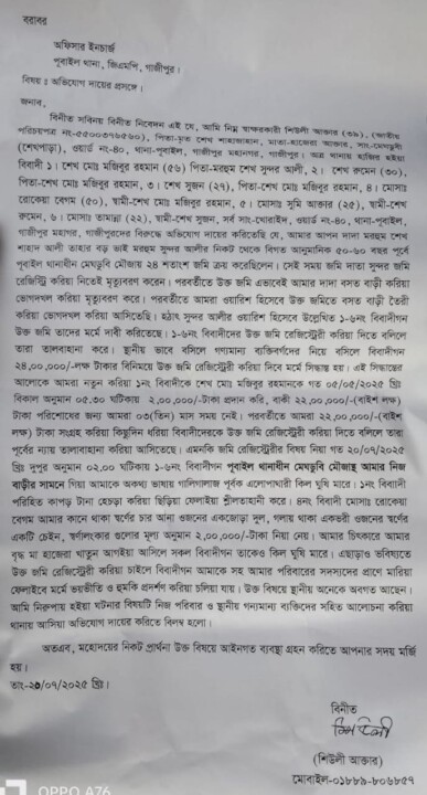 পূবাইলে ৫০-৬০ বছরের দখলীয় জমিতে বাঁধা , শ্লীলতাহানি ,বাড়িঘর ভাংচুর ও লুটপাটের অভিযোগ উঠেছে ঐ খোরাইদ এলাকার সুন্দর আলীর ছেলে মুজিবর ও তার পরিবারের বিরুদ্ধে।ঘটনাটি ঘটে রবিবার দুপুরে ৪০ নং ওয়ার্ডের মেঘডুবী শেখ বাড়ী উত্তর পাড়া এলাকায়।ভুক্তভোগী পরিবারের পক্ষে মৃত শাহজাহানের মেয়ে শিউলি আক্তার শেখ মুজিবুর রহমান,শেখ রুমেন, শেখ সুজন, রোকেয়া বেগম,সুমি আক্তার, তামান্নাসহ ৬ জনকে আসামী করে পূবাইল থানায় একটি লিখিত অভিযোগ দায়ের করেন।অভিযোগ সূত্রে জানা যায় বিগত ৫০ থেকে ৬০ বছর পূর্বে মেঘডুবি মৌজাস্হিত মরহুম শেখ সুন্দর আলীর নিকট হতে তার আপন সহোদর ভাই শেখ শাহাদ আলী ২৪ শতাংশ জমি ক্রয় করে বর্তমানে ভোগ দখল করা অবস্থায় হঠাৎ করে রবিবার দুপুরে মৃত শাহজাহানের পরিবারের উপর অতর্কিত হামলা চালায় সুন্দর আলীর ছেলে শেখ মুজিবর ও তার পরিবারের লোকেরা এতে করে নগদ টাকা ও স্বর্ণালংকার লুট করে নিয়ে গেছে বলে জানায় ভুক্তভোগী শিউলি আক্তার ও তার পরিবার।এলাকাবাসী জানান শাহাদ আলী ও তার ছেলে শাহজাহান দীর্ঘদিন ধরে ঘরবাড়ি নির্মাণ করে এ জমি ভোগ দখল করে আছে তারা আরও জানান,শেখ শাহাদ আলী ও তার ছেলে শেখ শাহজাহান জীবিত থাকা অবস্থায় কেউ এই জমি দাবি করে নাই।গত তিন মাস পূর্বে স্থানীয় বিএনপি নেতা নূর মোহাম্মদ নূর আলী ও কিছু গণ্যমান্য ব্যক্তিবর্গের নতুন করে সিদ্ধান্ত দেয় যে যেহেতু তল্লাশী দিয়ে ও পুরাতন দলিল খুঁজে পাওয়া যাচ্ছে না সে লক্ষে সামাজিক বিচারে সিদ্ধান্ত হয় ২৪ শতাংশ জমি ২৪ লক্ষ টাকা পুনরায় ভুক্তভোগী পরিবারের পক্ষ থেকে সুন্দর আলীর ছেলে মজিবুর গং দের দিলে তারা নতুন দলিল করে দিবে বলে ২ লক্ষ টাকা নগদ নেয়।এদিকে ভুক্তভোগীদের দাবি হামলাকারীরা তাদের প্রয়োজনীয় কাগজপত্র ও দালিলিক বস্তু চুরি করে নিয়ে গেছে
