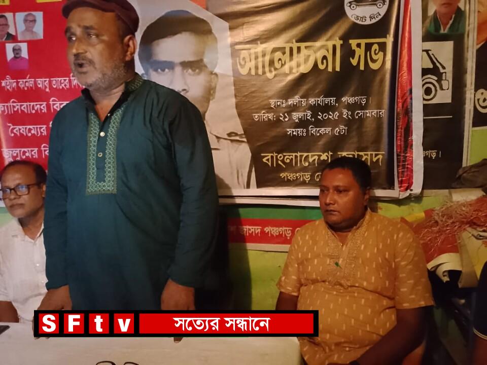 দলীয় কার্যালয়ে অনুষ্ঠিত আলোচনা সভায় প্রধান অতিথি ছিলেন বাংলাদেশ জাসদ পঞ্চগড় জেলা শাখার সভাপতি অধ্যাপক এমরান আল আমিন। সভার শুরুতে শহীদ কর্নেল আবু তাহেরের প্রতি শ্রদ্ধা নিবেদন ও ঢাকার উত্তরায় প্রশিক্ষণ বিমান দূর্ঘটনায় নিহত স্মরণে ও আহতদের দ্রুত আরোগ্য কামনা এবং শোক ও সমবেদনা প্রকাশ করে এক মিনিট নিরবতা পালন করা হয়। এমরান বলেন, শহীদ কর্নেল তাহের ছিলেন আপোষহীন নেতা, তাঁর নীতি আদর্শের প্রতি অবিচল থেকে অন্যায়ের কাছে মাথা নত করেননি বিধায় তদানিন্তন শাসকগোষ্টী কর্নেল তাহেরকে প্রহসন মূলক বিচারের মাধ্যমে ফাঁসির কাষ্ঠে ঝুলিয়ে হত্যা করেছিলেন। আজ সময় এসয় এসেছে কর্নেল তাহেরের লালিত স্বপ্ন বাস্তবায়নে বাংলাদেশ জাসদের সকল নেতাকর্মীদের ঐক্যবদ্ধ হয়ে দুর্নীতিমুক্ত শোষনমুক্ত সমাজ ও রাষ্ট্র গঠনে অবদান রাখার। তিনি অন্তর্বর্তীকালীন সরকারের প্রতি আহবান জানিয়ে বলেন, দেশে যে অস্থিতিশীল পরিবেশ ও আইন শৃংখলার অবনতির চিত্র দেখা যাচ্ছে তা থেকে উত্তরণে অতিসত্বর জাতীয় নির্বাচনের রোডম্যাপ প্রকাশ করুন। বাংলাদেশ জাসদ পঞ্চগড় জেলা শাখার যুগ্ম সাধারণ সম্পাবেন শেখ সাজ্জাদ হোসেনের সঞ্চালনায় সভায় অন্যান্যের মধ্যে বক্তব্য রাখেন বাংলাদেশ জাসদ পঞ্চগড় জেলা শাখার সহ-সভাপতি সামুস কিবরিয়া প্রধান, সাংগঠনিক সম্পাদক আজহারুল ইসলাম জুয়েল, প্রচার সম্পাদক সাজ্জাদ ভুট্টো, দপ্তর সম্পাদক মফিদার রহমান মঞ্জু , সদস্য হায়দার আলী, বাংলাদেশ জাসদ আটোয়ারী উপজেলা শাখার সভাপতি আনছার আলী মিঠুন, সাধারণ সম্পাদক নীতিশ চন্দ্র রায় প্রমূখ।