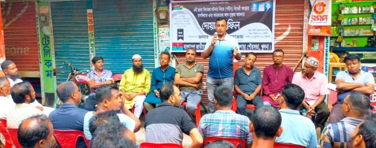 এম জালাল উদ্দীন:পাইকগাছা :: ঢাকার উত্তরায় মাইলস্টোন স্কুল এন্ড কলেজ ক্যাম্পাসে বাংলাদেশ বিমান বাহিনীর একটি প্রশিক্ষণ বিমান বিধ্বস্ত হয়ে মর্মান্তিক হতাহতের ঘটনা ঘটেছে। এই হৃদয় বিদারক ঘটনায় নিহতদের (শহীদ) বিদেহী আত্মার মাগফিরাত এবং আহতদের সুস্থতা কামনায় পাইকগাছায় বাংলাদেশ জাতীয়তাবাদী দল পৌর বিএনপি'র উদ্যোগ দোয়া মাহফিল অনুষ্ঠিত হয়। বুধবার বিকেলে উপজেলা বিএনপি কার্যালয়ের নিচে পৌরসভা বিএনপির আহ্বায়ক আসলাম পারভেজ এর সভাপতিত্বে এ দোয়া মাহফিল অনুষ্ঠিত হয়। পৌর যুগ্ম সম্পাদক এসএম মোহর আলীর সঞ্চালনায় দোয়া মাহফিল অনুষ্ঠানে পৌর যুগ্ম সম্পাদক সেলিম রেজা লাকি ও সাবেক কাউন্সিলর কামাল আহমেদ সেলিম নেওয়াজ, কাজী নেয়ামুল হুদা কামাল, আতাউর রহমান, জিয়া উদ্দিন নায়েব, মতলেব গাজী, নবনির্বাচিত ওয়ার্ড বিএনপি নেতা মোহাম্মদ আলী গাজী, রুহুল আমিন সরদার, বেলাল হোসেন, মনিরুল ইসলাম মন্টু, রুবেল সরদার, আনারুল ইসলাম গাজী, আব্দুল করিম গাজী, শাহাদুল ইসলাম, সিরাজুল ইসলাম, জাকির হোসেন, তুষার সরকার, বাবু মন্ডল, ডাঃ শাহাবুদ্দিন, মোশাররফ হোসেন বাবলু, জিএম জাকির হোসেন মিন্টু, অ্যাড. সুবেহ সাদিক, শাহিনুর রহমান, জিয়াউর রহমান, রফিকুল ইসলাম, ইব্রাহিম মোল্লা, মামুন, কাইয়ুম সরদার, আল আমিন মোড়ল, আসাদুজ্জামান, ওবায়দুল ইসলাম ডালিম, রাসেল শেখ ও রাজু গাজী উপস্থিত ছিলেন। দোয়া অনুষ্ঠান পরিচালনা করেন হাফেজ হুমায়ুন কবির।