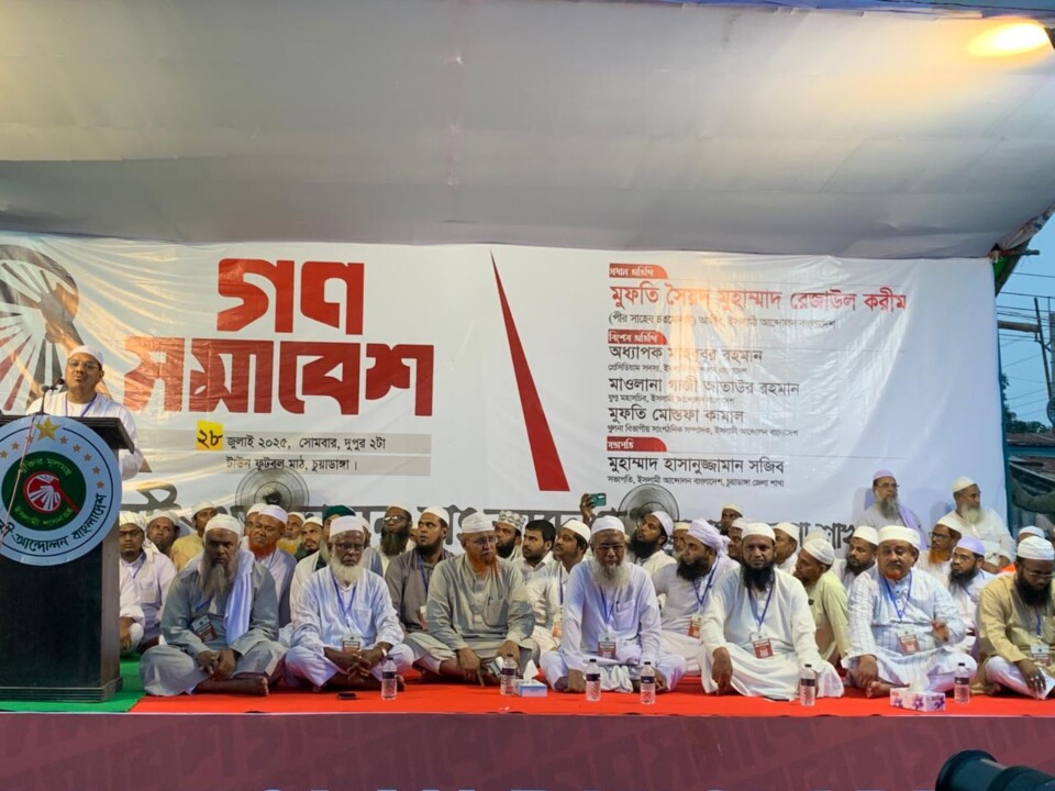মোঃ আব্দুল্লাহ হক : চুয়াডাঙ্গা জেলা শহরের টাউন ফুটবল মাঠে অনুষ্ঠিত হলো ইসলামী আন্দোলন বাংলাদেশ-এর ব্যতিক্রমধর্মী গণসমাবেশ। বিকাল ২টায় শুরু হওয়া এই ঐতিহাসিক সমাবেশে জেলাব্যাপী হাজারো নেতাকর্মী ও সাধারণ জনগণের ঢল নামে।সমাবেশে প্রধান অতিথি হিসেবে বক্তব্য রাখেন ইসলামী আন্দোলন বাংলাদেশ-এর আমীর, পীর সাহেব চরমোনাই মুফতি সৈয়দ মো. রেজাউল করিম। তিনি বলেন, “জুলাই আন্দোলনের মাধ্যমে জাতি এক নতুন ধাপ অতিক্রম করেছে। একদল চোর-ফ্যাসিস্ট বিদায় নিয়েছে, আর নতুন রূপে চাঁদাবাজ ও স্বৈরাচারীদের ক্ষমতায় আসতে দেওয়া হবে না। মানুষ এখন জানে কারা লুটেরা, কারা জাতির সঙ্গে প্রতারণা করে।”তিনি আরও বলেন,“১৯৮৭ সাল থেকে ইসলামী আন্দোলন বাংলাদেশ ইসলামী শাসন ও ইনসাফ প্রতিষ্ঠায় রাজপথে আছে, এবং ভবিষ্যতেও থাকবে। ইসলামী মূল্যবোধ, শান্তি ও সুবিচার প্রতিষ্ঠাই আমাদের চূড়ান্ত লক্ষ্য।”বিশেষ অতিথির বক্তব্যে ইসলামী আন্দোলনের প্রেসিডিয়াম সদস্য অধ্যাপক মাহবুবুর রহমান বলেন, “আগামী নির্বাচনে পিআর (প্রোপোরশনাল রিপ্রেজেন্টেশন) পদ্ধতি প্রয়োগ করতে হবে। জুলাই আন্দোলনের যথাযথ বিচার, রাজনীতি সংস্কার, ও নারীদের সুশিক্ষা নিশ্চিত করতে হবে। জনগণ আর কোনোভাবে দুর্নীতিবাজ ও দখলবাজদের ক্ষমতায় দেখতে চায় না।”খুলনা বিভাগীয় সংগঠনিক সম্পাদক মুফতি মোস্তফা কামাল বলেন, “বাংলাদেশকে একটি ন্যায়ভিত্তিক, ইনসাফপূর্ণ রাষ্ট্র হিসেবে গড়ে তুলতে সমস্ত ইসলামী দলগুলোকে এক প্ল্যাটফর্মে আনতে হবে। আমরা ঐক্যবদ্ধভাবে আলোকিত ভবিষ্যতের জন্য কাজ করছি।”সমাবেশের সভাপতিত্ব করেন চুয়াডাঙ্গা জেলা শাখার সভাপতি মুহাম্মদ হাসানুজ্জামান সজিব।এছাড়াও সমাবেশে অংশ নেন জামায়াতে ইসলামীর চুয়াডাঙ্গা জেলা আমীর অ্যাডভোকেট রুহুল আমিন, সহ-সেক্রেটারি অ্যাডভোকেট মাসুদ পারভেজ রাসেল, এবং বৈষম্যবিরোধী ছাত্র আন্দোলনের সাবেক আহ্বায়ক আসলাম হোসেন অর্ক। জামায়াত নেতারা রাষ্ট্র সংস্কার ও পিআর পদ্ধতির মাধ্যমে নির্বাচন দাবির পক্ষে বক্তব্য রাখেন।সমাবেশে বক্তারা বলেন, “জুলাই ও আগস্ট মাসের রক্তাক্ত ইতিহাস মানুষকে সচেতন করেছে। জেলখানা থেকে মুক্ত হয়ে আজকের এই শান্তির পর্ব—এটি জনগণের জাগরণের ফসল। আমরা আর কোনো ভোটকেন্দ্র দখলের নির্বাচন চাই না। জনগণের ভোটাধিকার রক্ষায় পিআর পদ্ধতি প্রয়োগ জরুরি। জুলাই হত্যাকাণ্ডের আগে কোনো নির্বাচন জনগণ মেনে নেবে না।”গণসমাবেশ শেষে ইসলামী আন্দোলন বাংলাদেশ চুয়াডাঙ্গা জেলার ১ ও ২ আসনের সংসদ সদস্য প্রার্থীর নাম ঘোষণা করা হয় চুয়াডাঙ্গা-১ আসনে মুফতি জহুরুল ইসলাম আজিজী ও চুয়াডাঙ্গা-২ আসনে মুহাম্মদ হাসানুজ্জামান সজিব