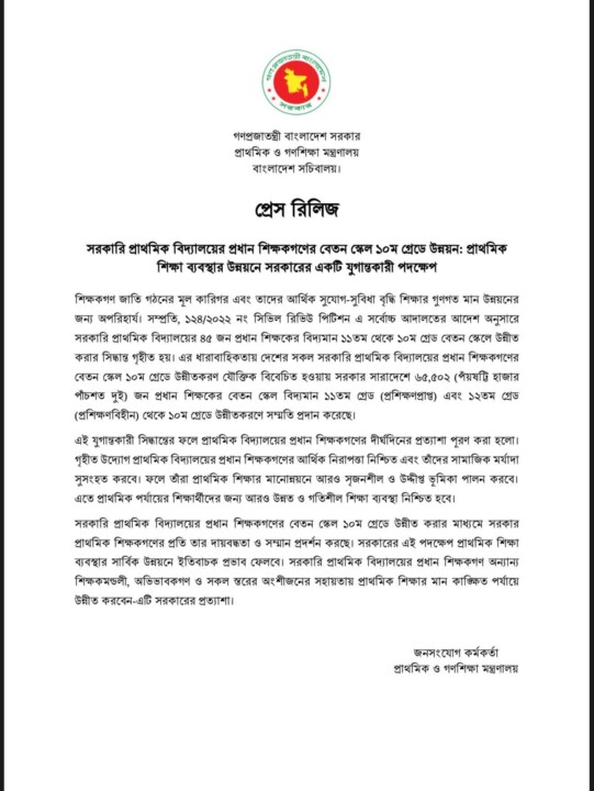 সরকারি প্রাথমিক বিদ্যালয়ের প্রধান শিক্ষকগণের বেতন স্কেল উন্নীত করে ১০ম গ্রেডে উন্নয়ন করেছে সরকার, যা প্রাথমিক শিক্ষাখাতে একটি যুগান্তকারী সিদ্ধান্ত হিসেবে বিবেচিত হচ্ছে। দেশের ৬৫,৫০২ জন প্রধান শিক্ষক এই সুবিধার আওতায় আসবেন।