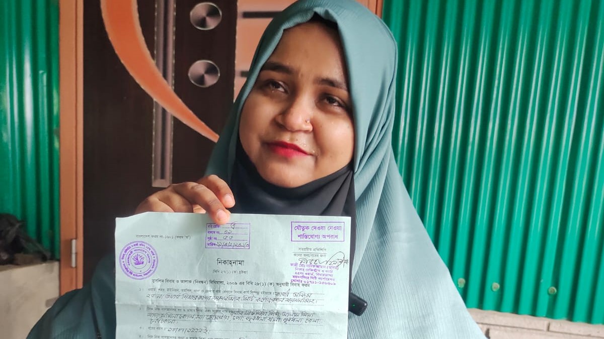 সাগর আহমেদ জজ, প্রতিনিধি : স্ত্রীর স্বীকৃতির দাবিতে সুমি আক্তার নামে এক তরুণী তার স্বামীর বসত বাড়িতে অনশন করছে। ঘটনাটি ঘটেছে নেত্রকোনা জেলার পূর্বধলা উপজেলার সদর ইউনিয়নের হিড়িভিটা গ্রামের মোঃ হানিফ মিয়া পিতাঃ আলাল মিয়ার বাড়িতে। অনশনরত সুমি আক্তার একই উপজেলার ভিতর গাঁও গ্রামের ফজলুল হকের মেয়ে। বৃহস্পতিবার (৩১ জুলাই) সকালে হিরিভিটা গ্রামে গিয়ে দেখা যায়, বাড়ির সামনে তরুণী অবস্থান করছে। এ খবর পেয়ে সুমি আক্তারের শশ্বুর, শ্বাশুড়ি ও তার পরিবারের লোকেরা ঘরে তালা দিয়ে বাড়ি ছেড়ে চলে যায়। অনশনরত সুমি আক্তার বলেন গত ২৯.০৬.২০২৩ইং তারিখে তাদের পরিবারের সম্মতি না নিয়ে ৩ লাখ টাকা কাবিনমুলে ইসলামী শরিয়ত মতে তারা বিবাহ বন্ধনে আবদ্ধ হয়। পরবর্তীতে স্বামী-স্ত্রী ময়মনসিংহ শহরের সানকি পাড়ায় একটি ঘর ভাড়া নিয়ে বসবাস করতে থাকে। সুখেই চলছিল তাদের দাম্পত্য জীবন। কিন্তু সুমি আক্তারের পরিবার গরিব বিধায় তার শ্বশুর-শাশুরী বিষয়টি মেনে নিতে পারেনি।প্রায় দুই বছর ঘর সংসার করার পর সুমি আক্তারের স্বামী মোঃ হানিফ মিয়ার পরিবারের চাপ সহ্য করতে না পেরে সে তার স্ত্রী সুমি আক্তারকে ময়মনসিংহ বাসায় ফেলে রেখে যোগাযোগ বন্ধ করে দেই। এদিকে অসহায় সুমি আক্তার কোন উপায়ন্তর না দেখে তার স্বামীর বাড়িতে গিয়ে স্ত্রীর দাবি নিয়ে অনশন করতে থাকে। পরে সুমি আক্তারকে স্বামী হানিফের পরিবারের লোকেরা এসে মারধর করে ঘর থেকে বের করে মেইন ঘর তালা লাগিয়ে হানিফ মিয়ার পিতা মোঃ আলাল মিয়া বাড়ী থেকে চলে যায়। এ বিষয়ে সাংবাদিকরা মোঃ হানিফ মিয়া ও তার পরিবারের সাথে যোগাযোগ করতে গেলে হানিফসহ তার পরিবারের কাউকে খুজে পাওয়া যায়নি, ফোনে যোগাযোগের চেষ্টা করলে ফোনও বন্ধ পাওয়া যায়। বর্তমানে সবকুল হারিয়ে সুমি আক্তার এখন দিশেহারা হয়ে পড়েছে। না পারছে পিত্রালয়ে থাকতে, না পাচ্ছে স্বামীর স্বীকৃতি। সে সাংবাদিক ও স্থানীয় প্রশাসনের আশুহস্তক্ষেপ কামনা করেছে। পূর্বধলা থানার অফিসার ইনচার্জ (ওসি) মোঃ নুরে আলম জানান, এব্যাপারে কোন পক্ষ থেকে অভিযোগ পায়নি। অভিযোগ পেলে তদন্ত করে আইনি ব্যবস্থা গ্রহণ করা হবে।