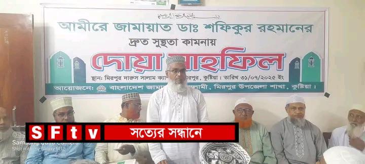 মো মাজহারুল ইসলাম: বাংলাদেশ জামায়াতে ইসলামী মিরপুর উপজেলা শাখা কতৃক আয়োজিত আমিরে জামায়াত ডা. শফিকুর রহমান এর দ্রুত সুস্থতা কামনায় দোয়া মাহফিল অনুষ্ঠিত হয়। বৃহস্পতিবার বিকালে মিরপুরে এ দোয়া মাহফীল অনুষ্ঠিত হয়। জামায়াতের মিরপুর উপজেলা আমীর মাওলানা রেজাউল করিমের সভাপতিত্বে দোয়া মাহফীলে প্রধান অতিথি ছিলেন কুষ্টিয়া জেলা জামায়াতের আমির অধ্যাপক মাওলানা আবুল হাশেম। বিশেষ অতিথি ছিলেন জামায়াতের কুষ্টিয়া জেলা নায়েবে আমীর মিরপুর উপজেলা পরিষদের সাবেক চেয়ারম্যান হাজী আব্দুল গফুর। উপস্থিত ছিলেন জামায়াতের নেতা অধ্যাপক জোমারাত আলী, অধ্যাপক নুরুল আমিন জসীম।