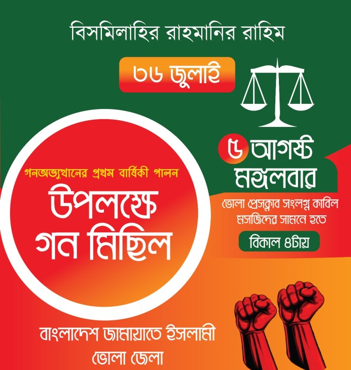 মোঃ আব্দুর রহমান হেলাল :আগামীকাল, ৫ আগস্ট (সোমবার) বিকেল ৪টায় গণঅভ্যুত্থানের প্রথম বার্ষিকী উপলক্ষে ভোলায় বাংলাদেশ জামায়াতে ইসলামীর উদ্যোগে বিভিন্ন উপজেলায় গণমিছিল অনুষ্ঠিত হবে।“৩৬শে জুলাই গণঅভ্যুত্থানের প্রথম বার্ষিকী” উপলক্ষে কেন্দ্র ঘোষিত জাতীয় কর্মসূচির অংশ হিসেবেই এই গণমিছিলের আয়োজন করা হয়েছে। দলীয় সূত্রে জানা গেছে, কর্মসূচিকে সফল করতে ভোলা জেলা জামায়াতের পক্ষ থেকে প্রতিটি উপজেলার নেতাকর্মীদের উদ্দেশে বিশেষ নির্দেশনা পাঠানো হয়েছে এবং সকল পর্যায়ে চলছে ব্যাপক প্রস্তুতি। দলীয় নেতৃবৃন্দ জানিয়েছেন, ইতোমধ্যে জেলার বিভিন্ন স্থানে গণসংযোগ, লিফলেট বিতরণ ও কর্মীসভা সম্পন্ন হয়েছে। অংশগ্রহণ নিশ্চিত করতে স্থানীয় পর্যায়ে ব্যাপক প্রচারণা চালানো হচ্ছে। প্রসঙ্গত, গত বছর এই সময়ে দেশের রাজনৈতিক অঙ্গনে ঘটে যাওয়া ছাত্র-জনতার গণআন্দোলন ও পরিস্থিতিকে “গণঅভ্যুত্থান” হিসেবে অভিহিত করে জামায়াত দিনটিকে প্রতিবছর স্মরণে রাখার ঘোষণা দেয়।