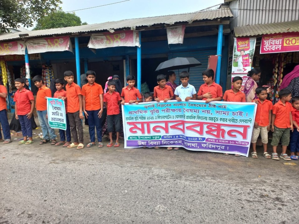 জুলাই বিপ্লবের বাংলায় বৈষম্য কোন ঠাঁই নাই। প্রাথমিক বৃত্তি পরীক্ষায় বৈষম্যহীন সাম্য চাই। এই প্রতিবাদ্য বিষয়কে সামনে রেখে প্রাথমিক বৃত্তি পরীক্ষা ২০২৫ এ কিন্ডার গার্ডেন ও বেসরকারি প্রাথমিক বিদ্যালয়ের অন্তর্ভুক্ত করার দাবিতে ফরিদপুরের সালথা উপজেলায় মানববন্ধন করেছে কিন্ডারগাটেন স্কুল শিক্ষক অভিভাবক ও শিক্ষার্থীরা। আজ সোমবার (৪ আগস্ট) সকল ১০ টায় উপজেলা কিন্ডারগার্ডেন অ্যাসোসিয়েশনের আয়োজনে উপজেলা পরিষদের সামনে ঘন্টা ব্যাপী এ মানববন্ধনে অংশগ্রহণ করেন ৯ টি আন্ডার গার্ডেনের স্কুলের ৬ শতাধিক শিক্ষার্থী ও শিক্ষক অভিভাবক সহ অনেকেই। মানববন্ধন শেষে উপজেলা নির্বাহী অফিসার ও উপজেলা শিক্ষা অফিসার বরাবর একটি স্মারকলিপি জমা দেন কিন্ডার গার্ডেনের শিক্ষকরা। মানববন্ধনে বক্তব্য রাখেন, উপজেলা কিন্ডার গার্টেন এসোসিয়েশনের সভাপতি মুহাম্মদ ওয়ালীউজামান, সাধারণ সম্পাদক বিপ্লব সাহা, কোষাধক্ষ্য মিয়া মোহাম্মদ লিয়াকত হোসেন, সাংগঠনিক সম্পাদক সুজিত দত্ত, ফুলবাড়িয়া কিন্ডার গার্টেনের মজিবুর রহমান নানু প্রমুখ।