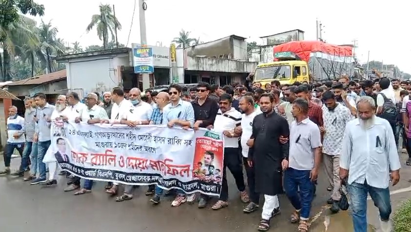 তৌহিদ, মাগুরা: মাগুরাতে জুলাই ২৪শের গণঅভ্যুত্থানে শহীদ মেহেদী হাসান রাব্বিসহ ১০জন শহীদের স্মরণে শোক র্যালী আলোচনা সভা ও দোয়া মাহফিল অনুষ্ঠিত হয়েছে। সোমবার ৪ আগষ্ট দুপুর ১২ টায় মাগুরা শহরের পারনান্দুয়ালী বেপারীপাড়া মসজিদ এর সামনে থেকে একটি শোক র্যালী বের হয়।