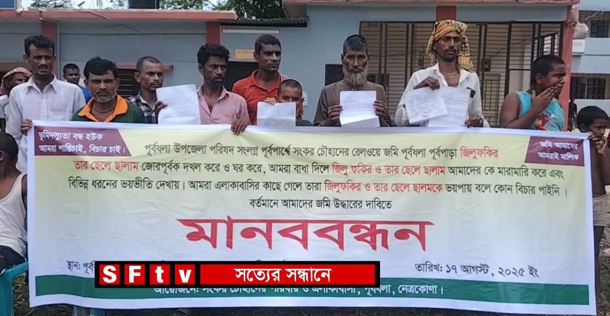 পূর্বধলা (নেত্রকোণা) প্রতিনিধি: “ভূমিদস্যুতা বন্ধ হউক, আমরা শান্তি চাই, বিচার চাই” এমন স্লোগানে পূর্বধলায় জমি উদ্ধারের দাবিতে মানববন্ধন অনুষ্ঠিত হয়েছে।