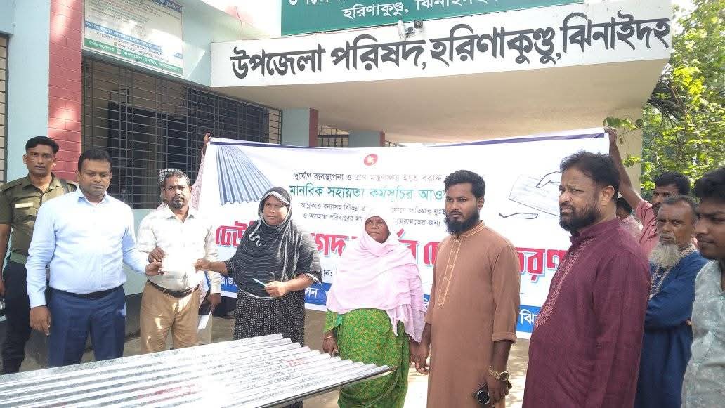 হরিণাকুন্ডুতে দুর্যোগ ব্যবস্থাপনা অধিদপ্তরের মানবিক সহায়তা: ১২০ বান্ডিল ঢেউটিন ও নগদ অর্থ বিতরণ